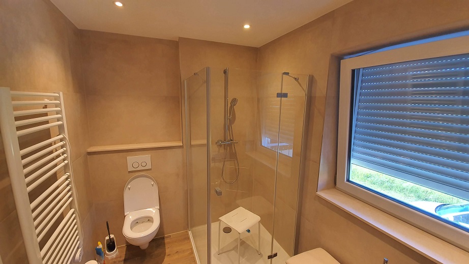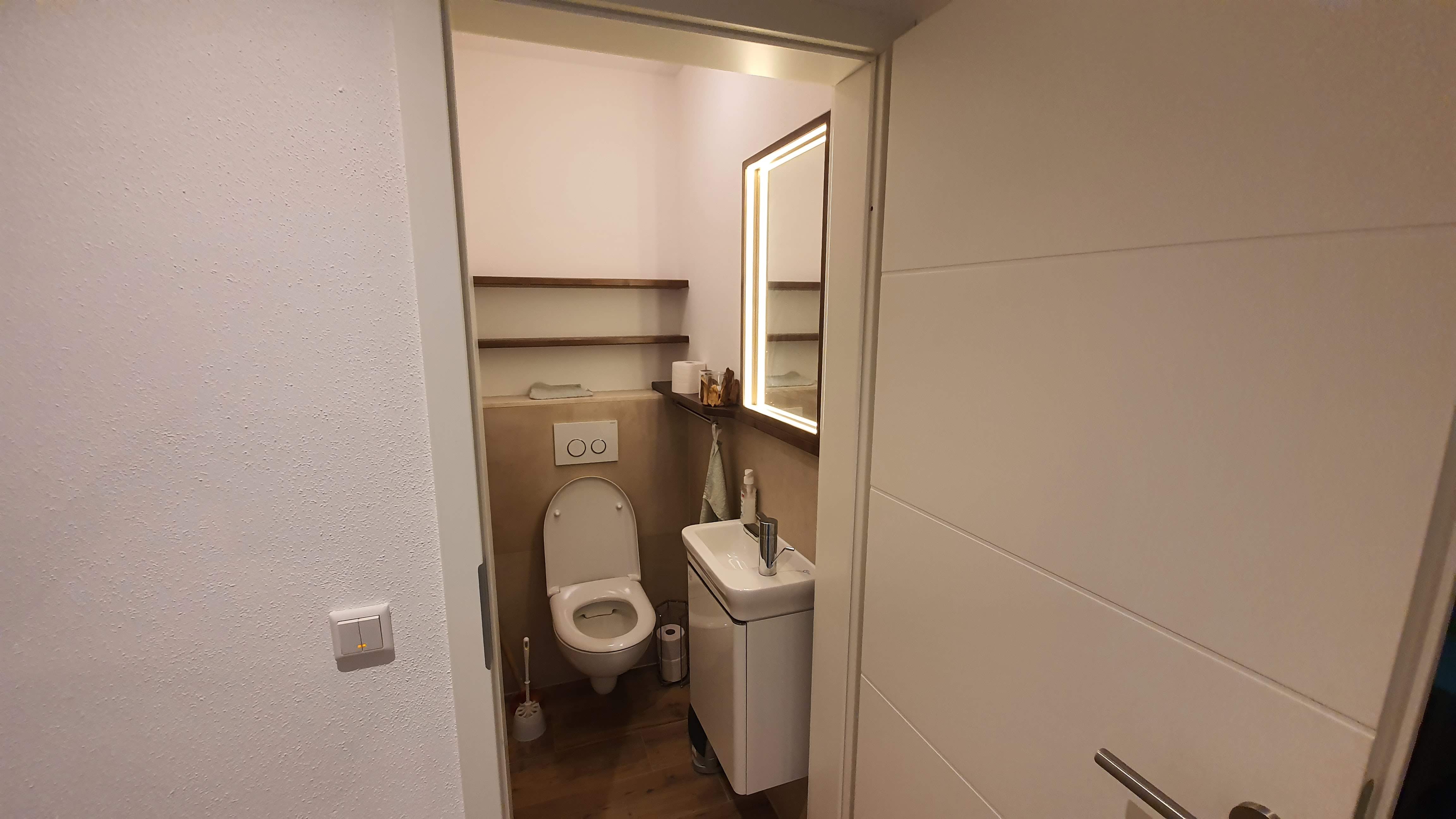 Neben dem Badezimmer mit großer Dusche und Waschmaschine gibt es eine separate Toilette und im Flur finden Sie viel zusätzlichen Stauraum.