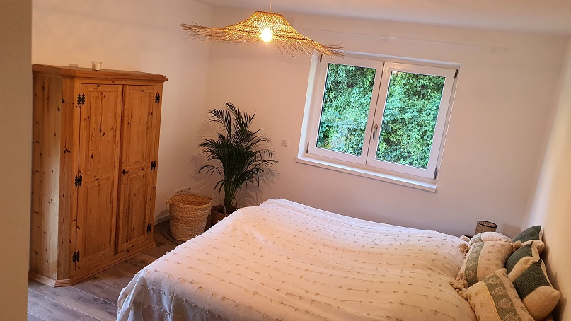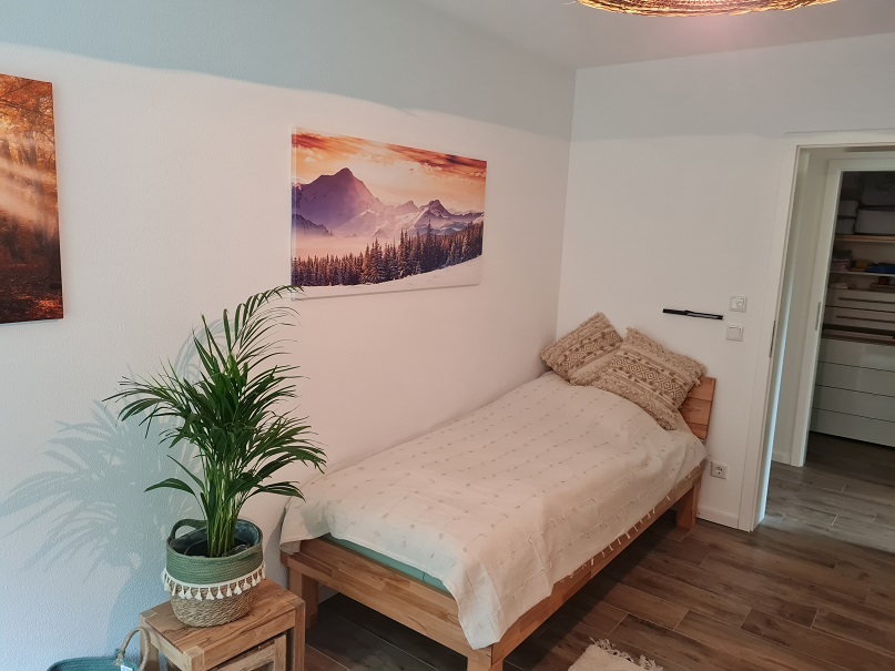 Wir haben großen Wert auf eine helle und schlanke Einrichtung gelegt, damit der Kopf frei werden kann. Ebenso wichtig war uns auch, dass die Ferienwohnung allergikerfreundlich bleibt. Zwei Schlafzimmer stehen zur Verfügung. Das eine (Balkonzimmer) bietet Ihnen ein großes Doppelbett. Im anderen finden Sie zwei Einzelbetten, die wir Ihnen bei Bedarf auch gerne zu einem Doppelbett zusammenstellen. Die Betten sind aus Massivholz.