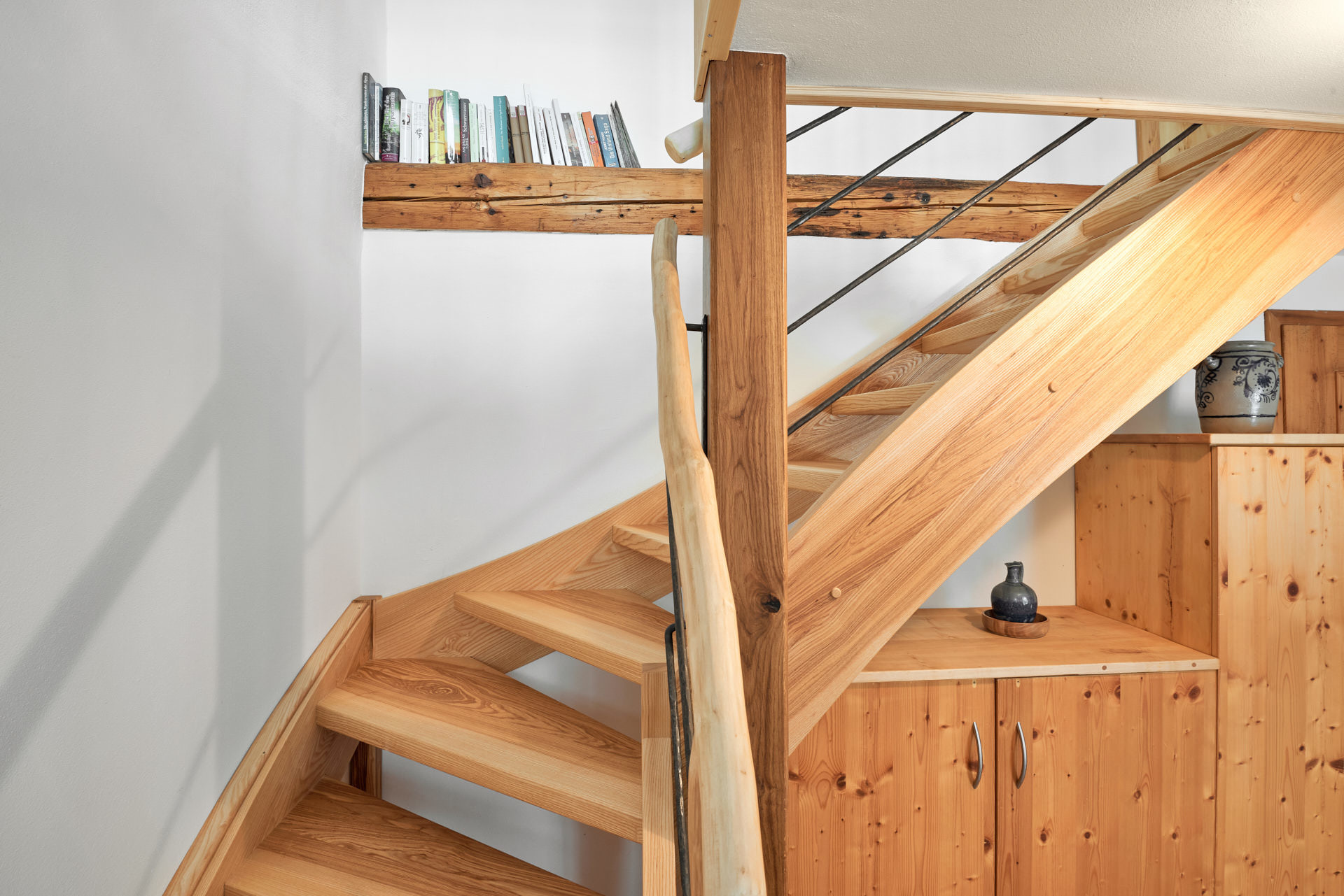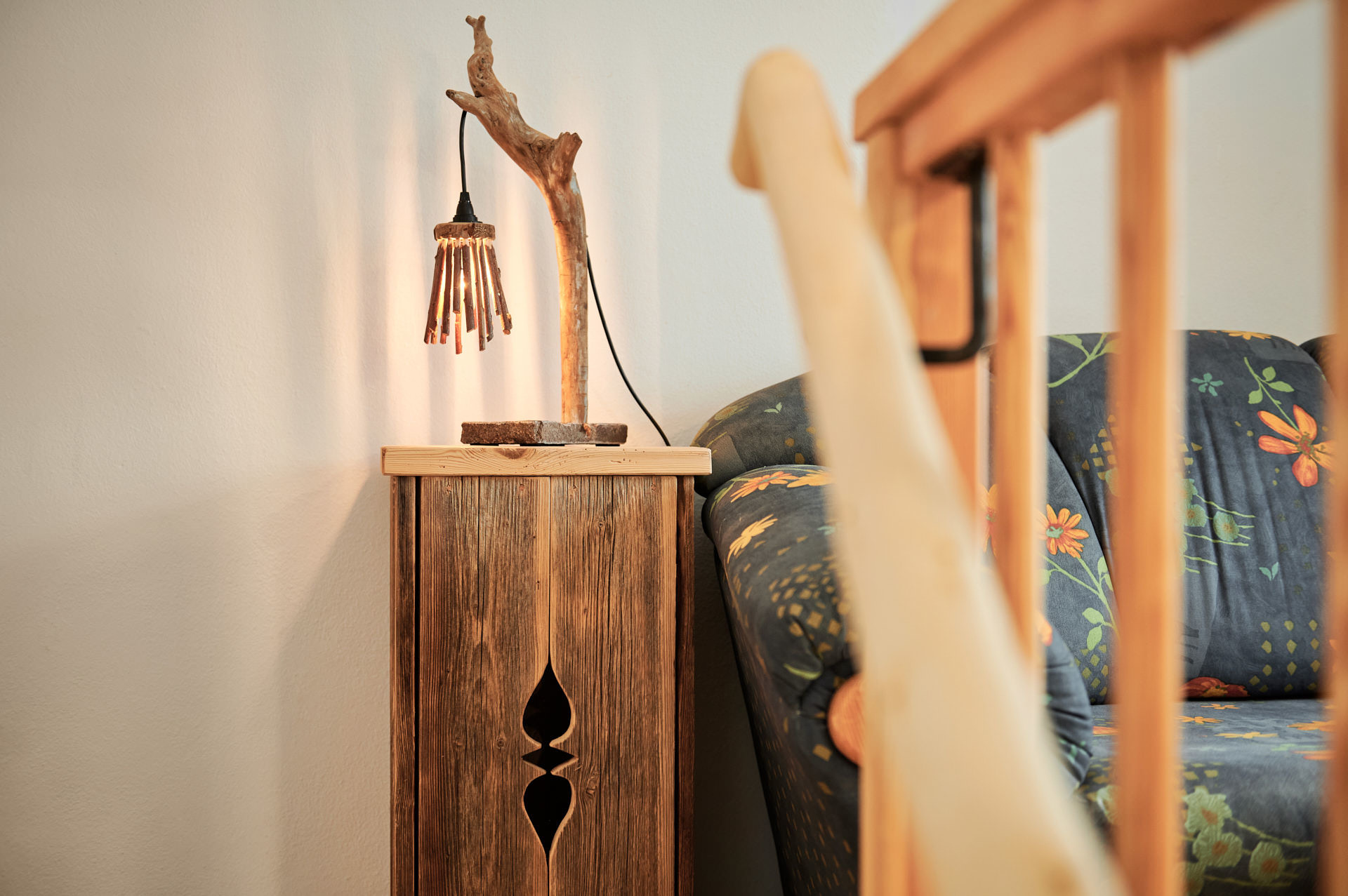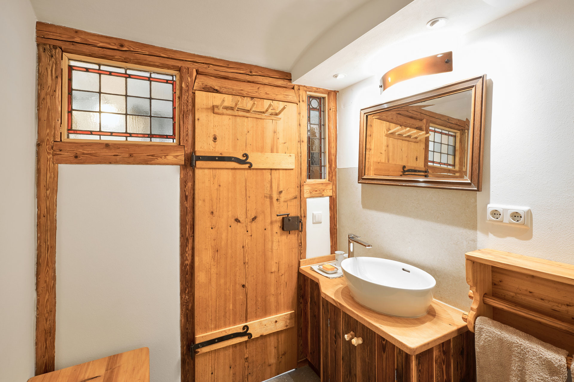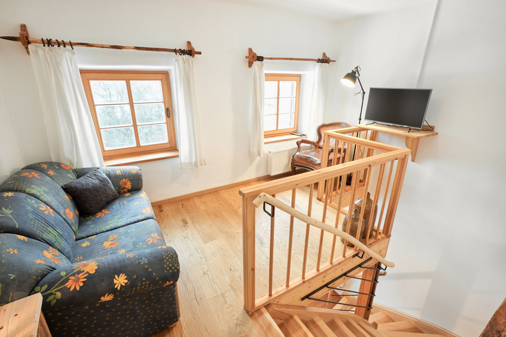 Die Wohnung Beim Sattler verfügt im Erdgeschoß über einen Wohn-/Essraum mit komplett eingerichteter Küchenzeile. Das Bad ist mit Dusche/WC, Waschtisch und Fön ausgestattet. Über die Diele mit Garderobe und Schuhbank erreicht man den 1. Stock. Dort befindet sich das Schlafzimmer mit großem Doppelbett ( 2x2 Meter/hochwertige Matratzen), Kleiderschrank und großer Kommode. Bei Bedarf kann ein Kindergitterbett für ein Kleinkind gemietet werden. Zwischen Schlafzimmer und Treppe wurde eine offene Loggia mit Fernseher und Leseraum eingerichtet. Dort steht eine Schlafcouch (1,25 x 2 m) für eine weitere Person zur Verfügung. Die gesamte Ferienwohnung ist mit geölten Holzböden ausgestattet (Ausnahme im Bad), liebevolle Details sorgen für eine heimelige Atmosphäre. Direkt vor dem eigenen Eingang liegt die Ostterrasse mit Sitzgelegenheit und Grill, ein kleiner Garten sowie der KFZ- Stellplatz. Für Fahrräder oder Ski ist ein abschließbarer Abstellraum vorhanden. Achtung - für kleine Kinder besteht eine erhöhte Aufsichtspflicht, da sich direkt nebenan unser Teich befindet.