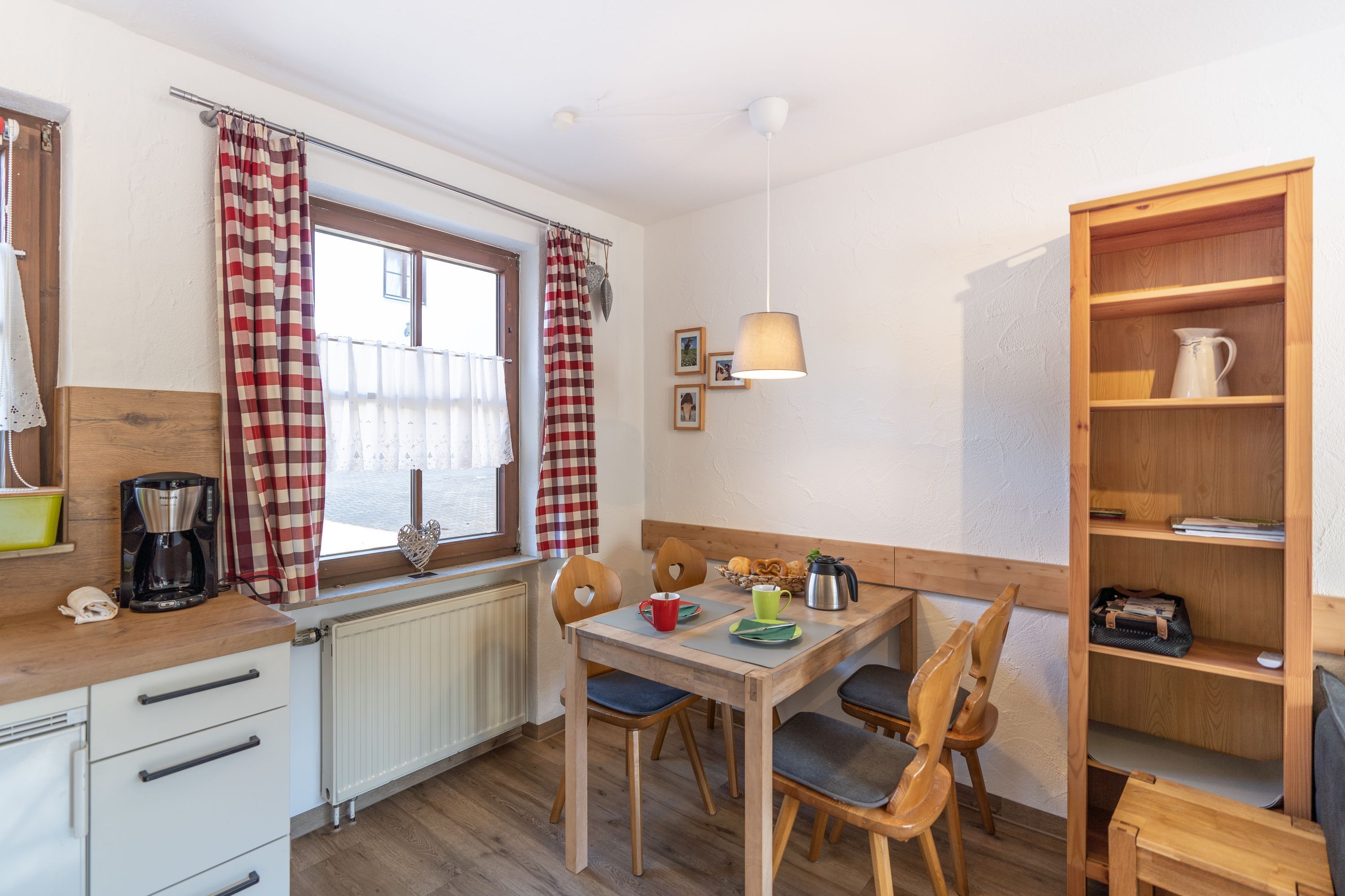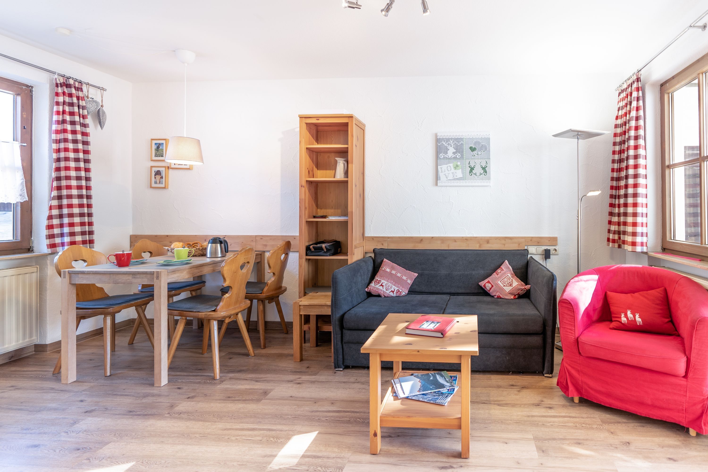 Die liebevoll eingerichtete 2-Zimmer-Ferienwohnung bietet Platz für 2 Erwachsene. Genießen Sie den gemütlichen Wohn-/Essbereich mit Terrasse und tollen Blick in die Berge, um den Tag gemütlich ausklingen zu lassen. Die im Wohnzimmer befindliche kleine Schlafcouch mit einer Liegefläche von 140 cm, bietet Platz für eine zusätzliche Person. Das separate Schlafzimmer mit Doppelbett, Kleiderschrank und Kommode bietet genügend Stauraum für Ihre Urlaubsgarderobe. Die modern eingerichtete Küchennische und das Bad mit begehbarer Dusche werden Sie begeistern.