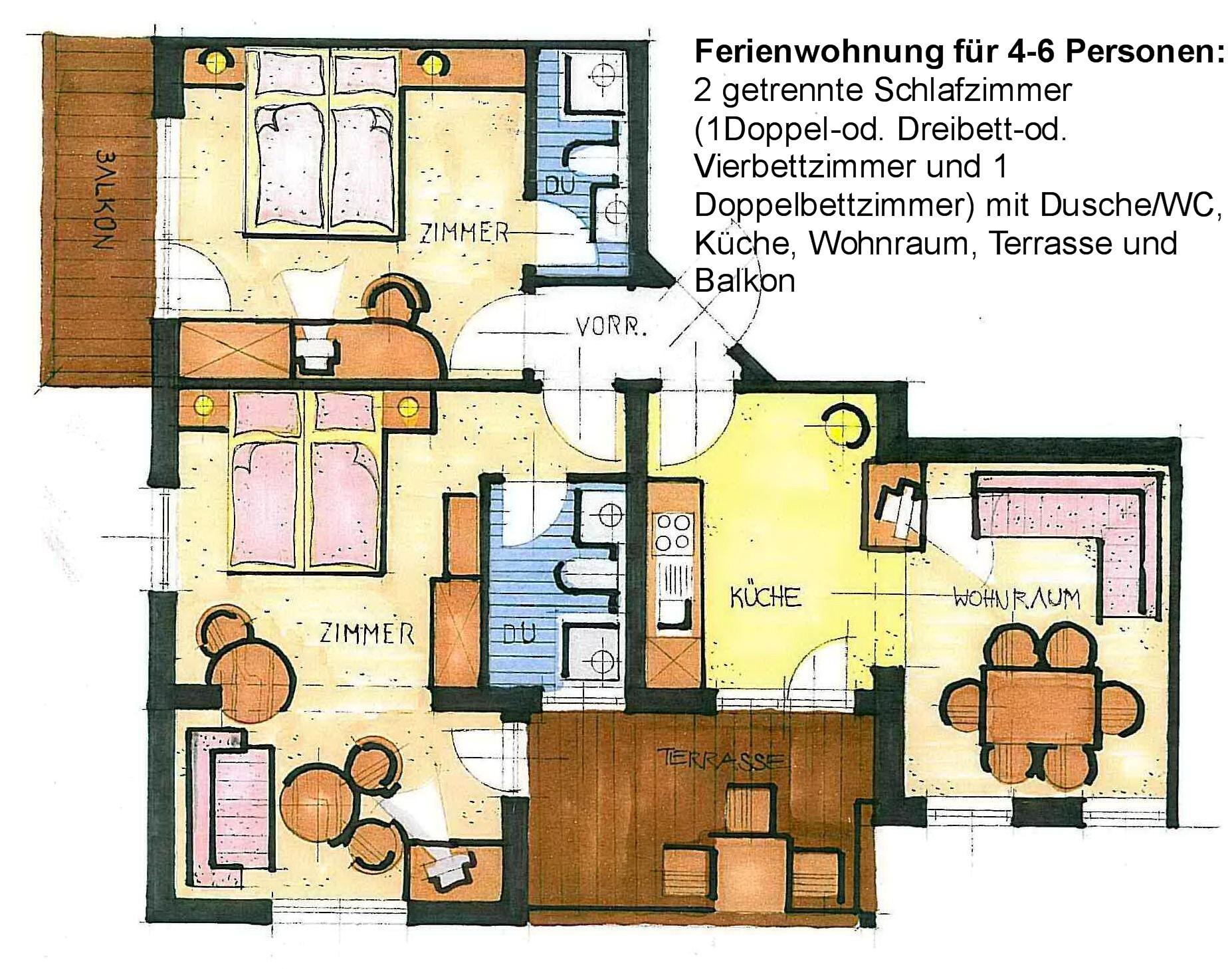 Geräumige ca. 75 m² große Ferienwohnungen für 2-6 Personen, neu renoviert und liebevoll mit hellem tiroler Holz eingerichtet; bestehend aus 2 getrennten Schlafzimmern (1 Vierbett- und 1 Doppelbettzimmer) mit jeweils eigener Dusche/WC inkl. Fön; LCD-Flachbild-SAT-TV mit Radio, Zimmersafe und Balkon/Terrasse.