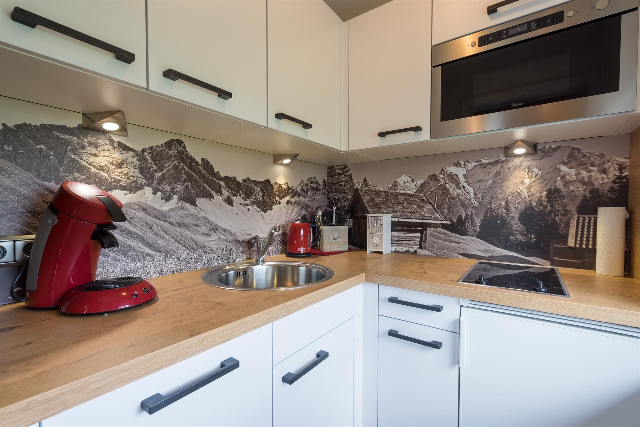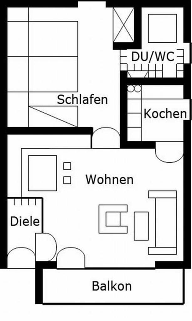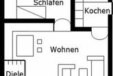 Ferienwohnung mit einem Schlafzimmer, Küche mit Spülmaschine, Kombigrill, Senseo-Kaffemaschine, Sat-TV, DU/WC sowie Ostbalkon.