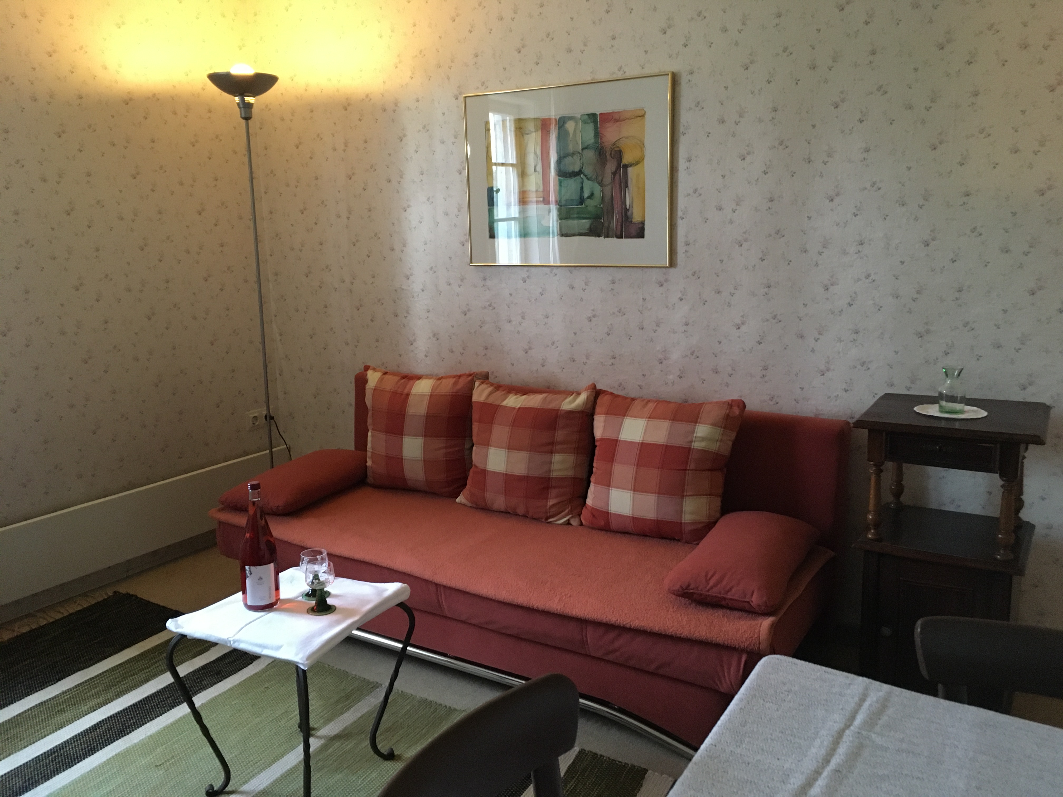Unsere kleinste Ferienwohnung im 1. OG des Mittelbaus mit 40 qm ist sehr gemütlich und ruhig. Bestens geeignet für zwei Personen. Schlafzimmer mit Boxspringbett (1,60 m), Wohnzimmer mit kleinem Esstisch, Küche und Bad mit Badewanne.