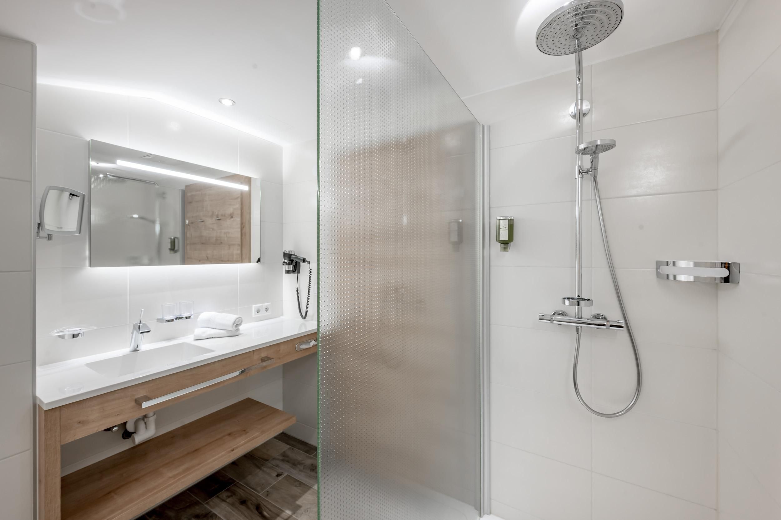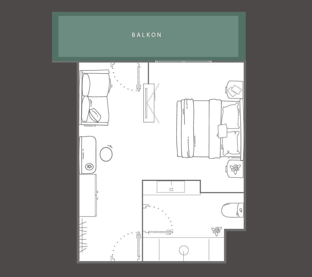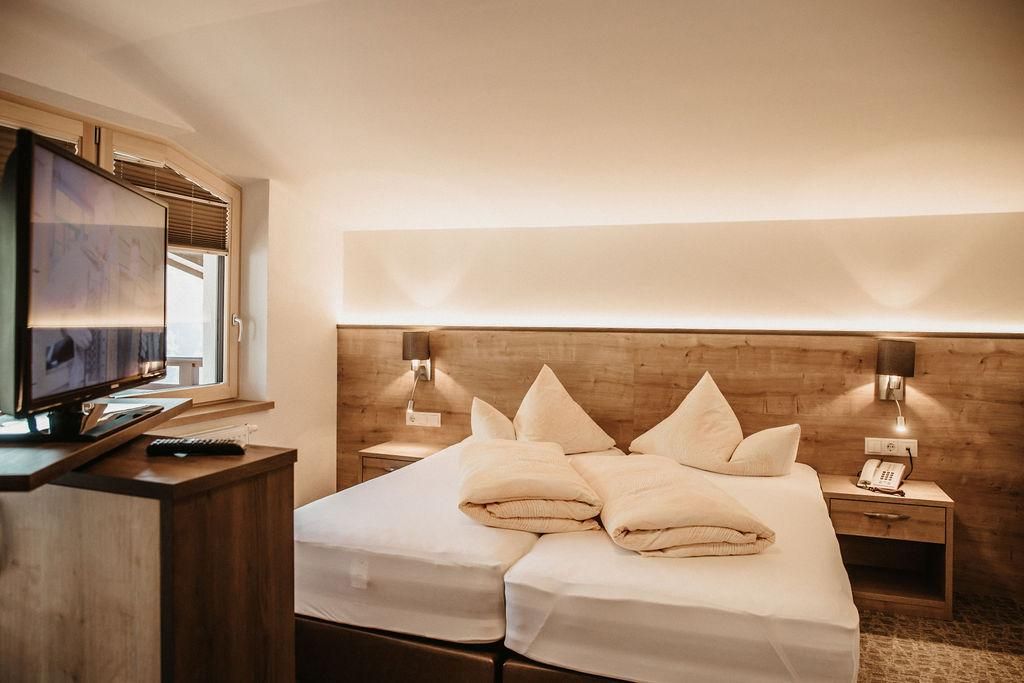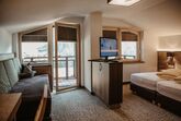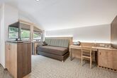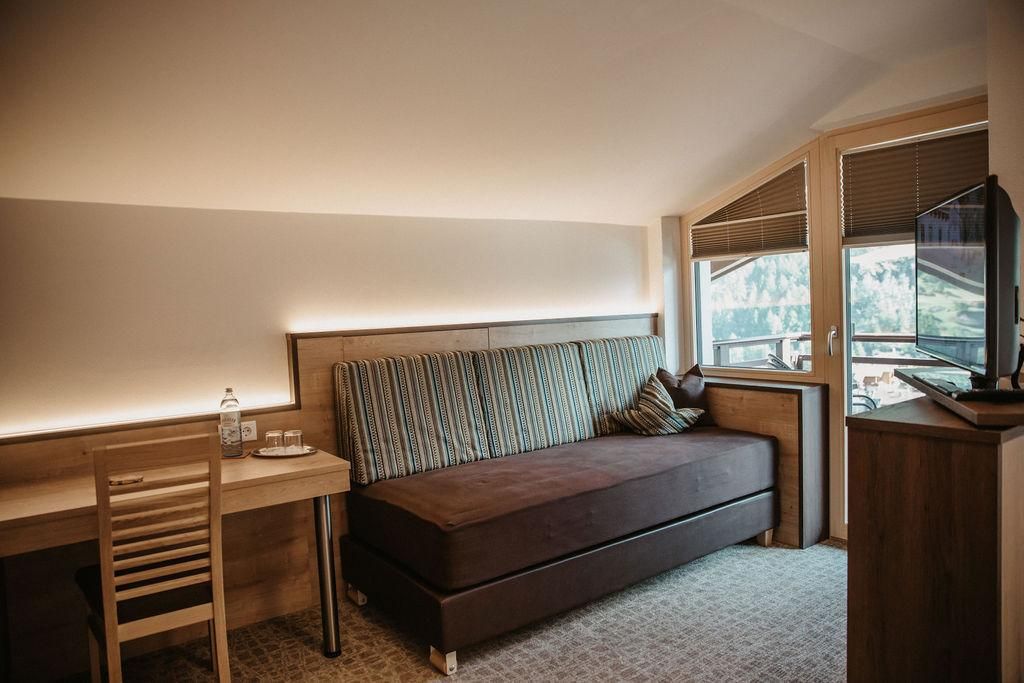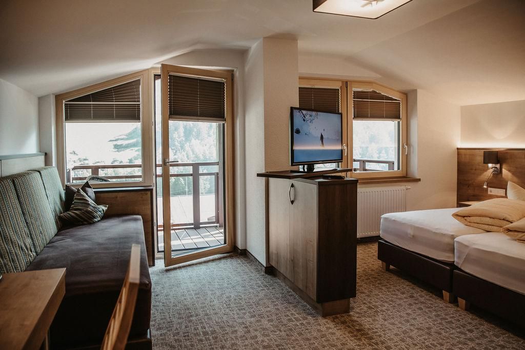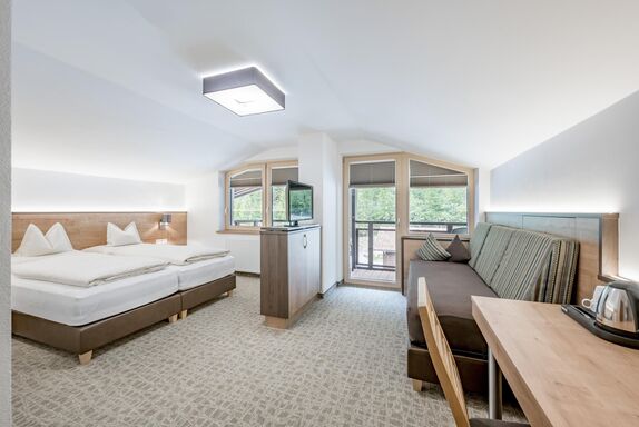Ca. 30 m² aufgeteilt auf 1 Doppelzimmer mit Boxspring-Bett und einem zusätzliches Boxspringbett für eine 3. Person (sieht optisch aus wie eine Couch). Badezimmer mit Dusch, Raindancebrause und WC; Kabel-Flat-TV, Telefon, Safe. Zimmer in der 3. Etage mit herrlicher Aussicht und eigenem, separatem Balkon.