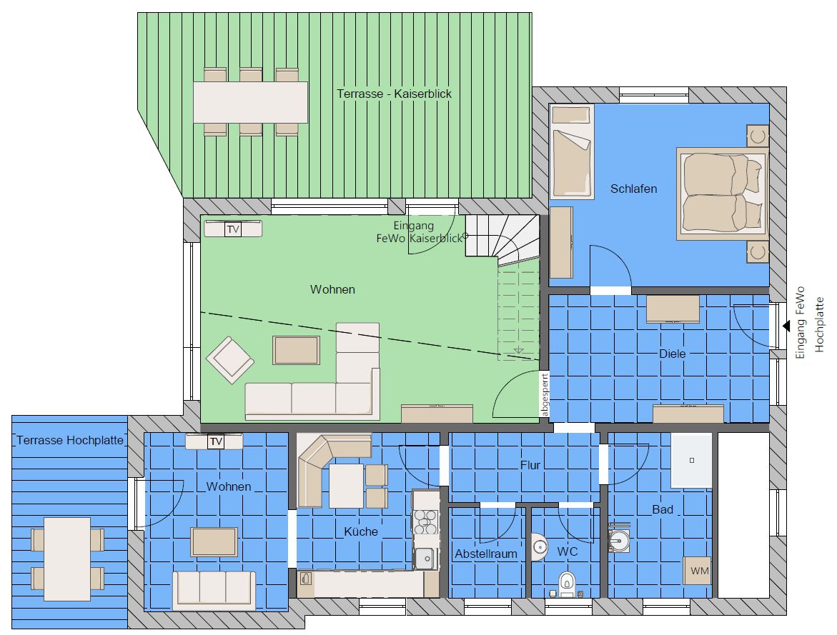 • Beide Wohnungen können über eine Türe miteinander verbunden werden (ideal für größere Familien/Gruppen)