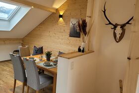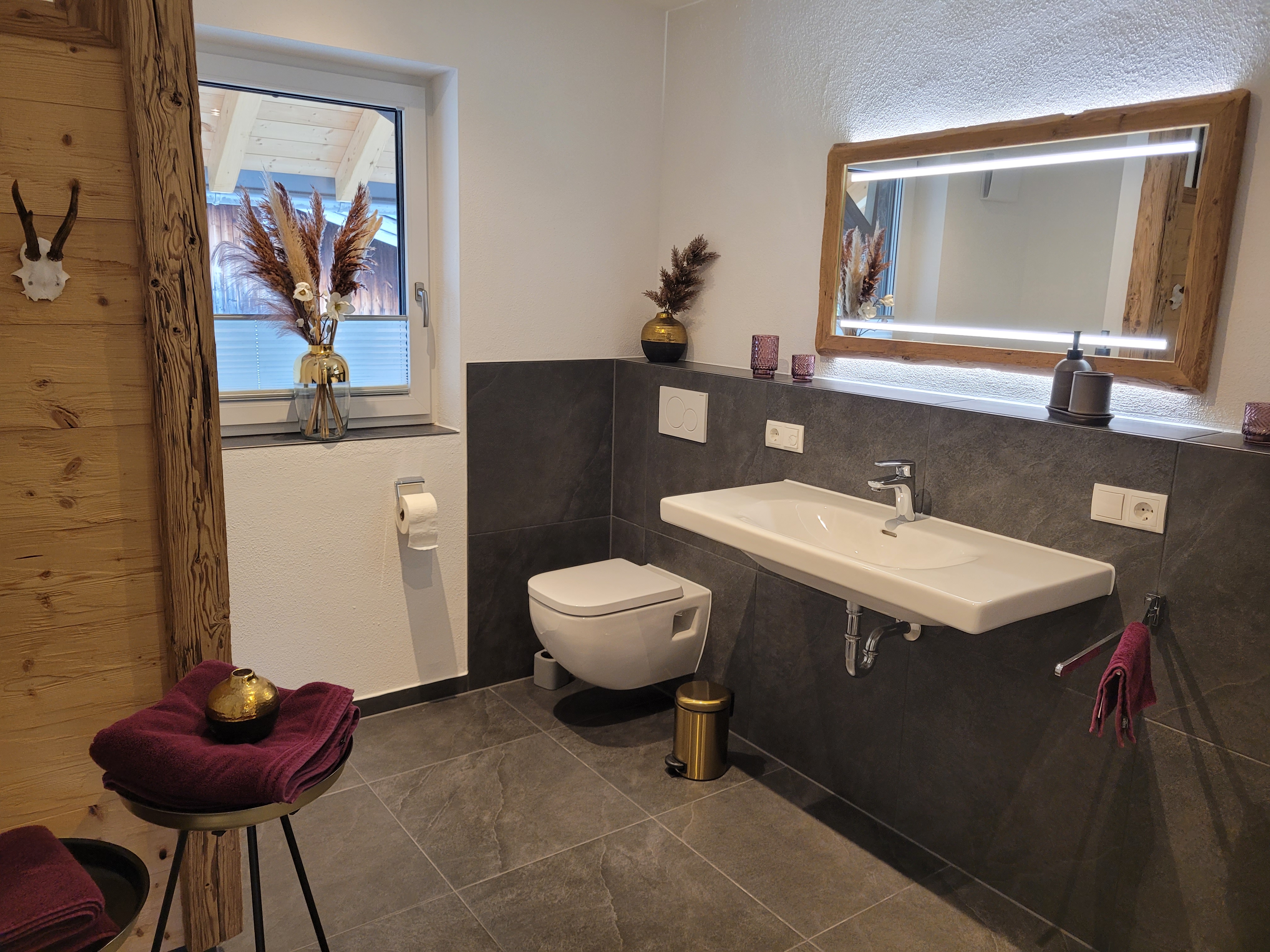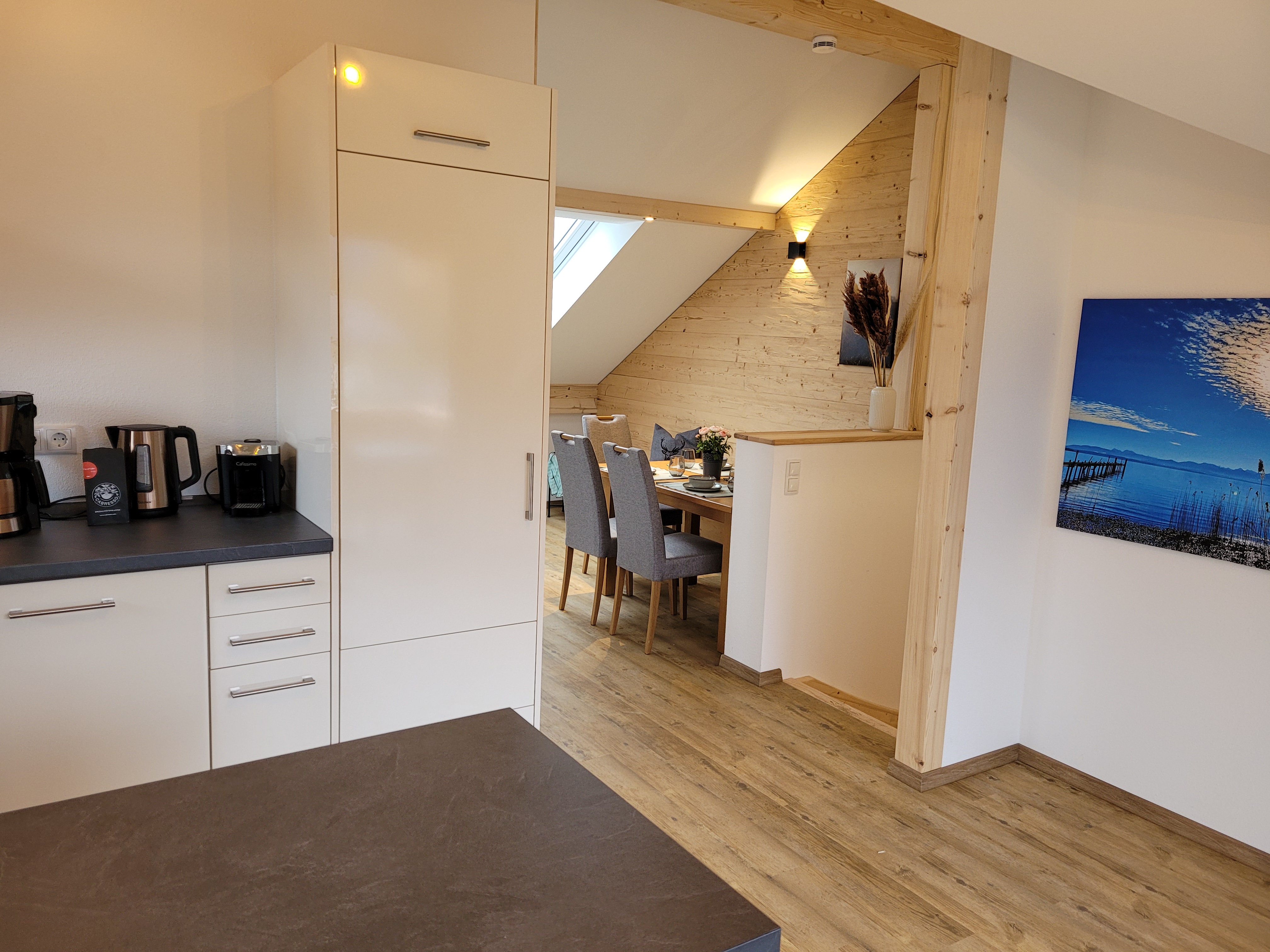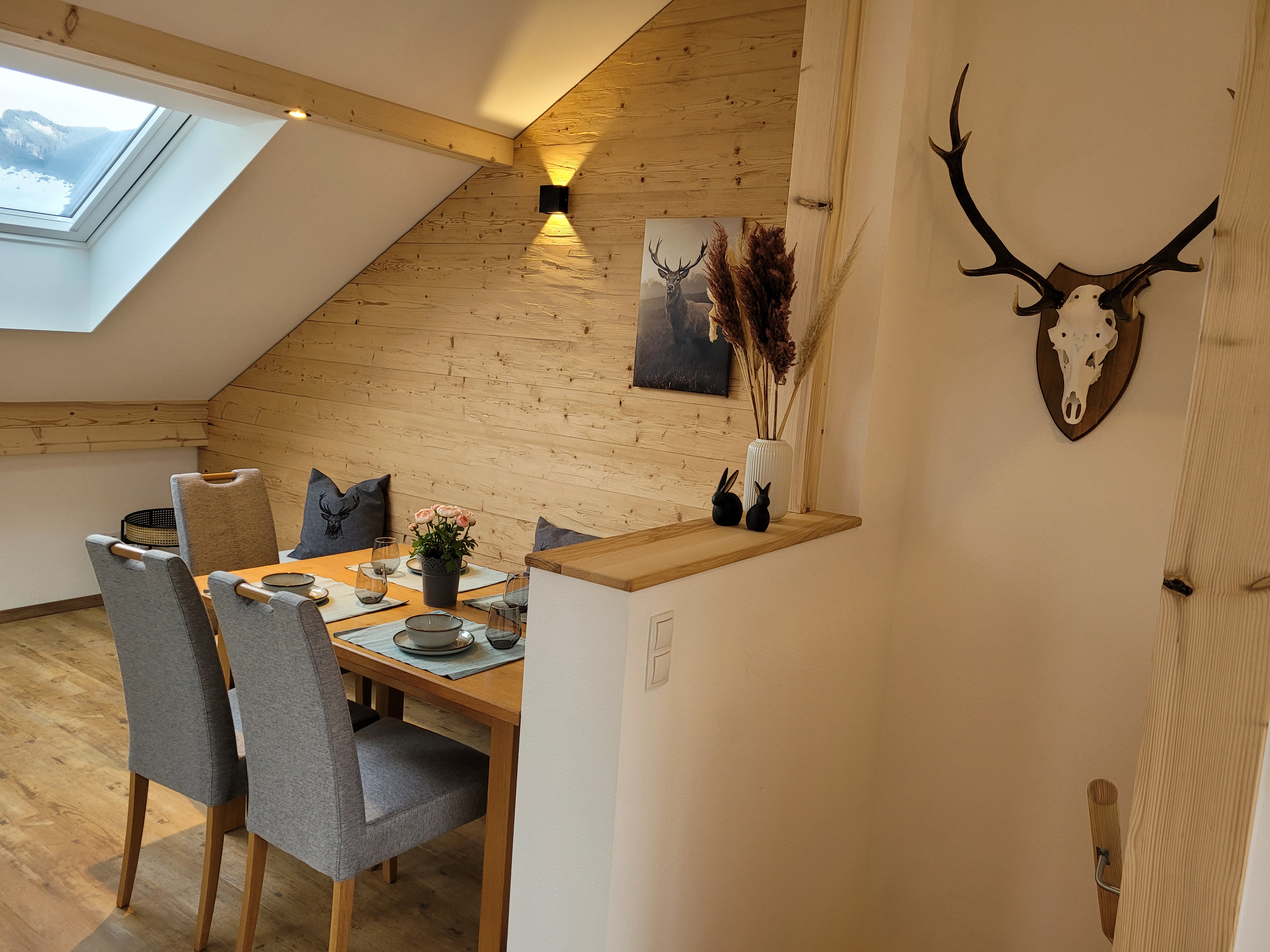 Unsere neu entstandene, 5 Sterne-Ferienwohnung ist sehr stilvoll und hochwertig eingerichtet. Die Mischung zwischen rustikalen Holzelementen und modernen Ambiente verleiht der Wohnung einen besonderen Flair. In der sehr lichtdurchfluteten Wohnküche im Dachgeschoss fühlt man sich sofort wie zu Hause. Dieser Bereich und auch der Rest der Wohnung ist gut geschützt vor sommerlicher Hitze durch Rollos und Raffstores. Im hinteren Teil des offenen Raumes kann man auf unserer großen Familiencouch den Tag gemütlich zum Ausklang bringen. Dort befindet sich auch der einladende Essbereich. Im vorderen Teil ist die großzügige Küche, von der aus man einen Kaffee mit Bergblick genießen kann. Von hier aus ist der Zugang zum überdachten Balkon möglich, der sich auf der Westseite befindet und von dem aus man einen wunderbaren Blick auf die Hochplatte bishin zum, in Tirol liegenden, Wilden Kaiser hat. Die zwei Schlafzimmer sind ausgestattet mit zwei Doppelbetten in der Größe 180x200 cm. Im Zirbenzimmer kann man den Duft der wohltuenden, ätherischen Öle der massiven Zirbenmöbel auf sich wirken lassen. Im Eichenzimmer findet man ein sehr hochwertig ausgestattetes Schlafzimmer mit Rustikalmassiveichenmöbel mit großem Kleiderschrank. Im geräumigen Bad befindet sich eine ebenerdige große Dusche. Die Wohnung ist mit einer kontrollierten Wohnraumlüftung ausgestattet und so auch für Allergiker gut geeignet. Die Eingangstür der Wohnung befindet sich im 1.Stock, zu der man durch eine separate Außentreppe kommt.