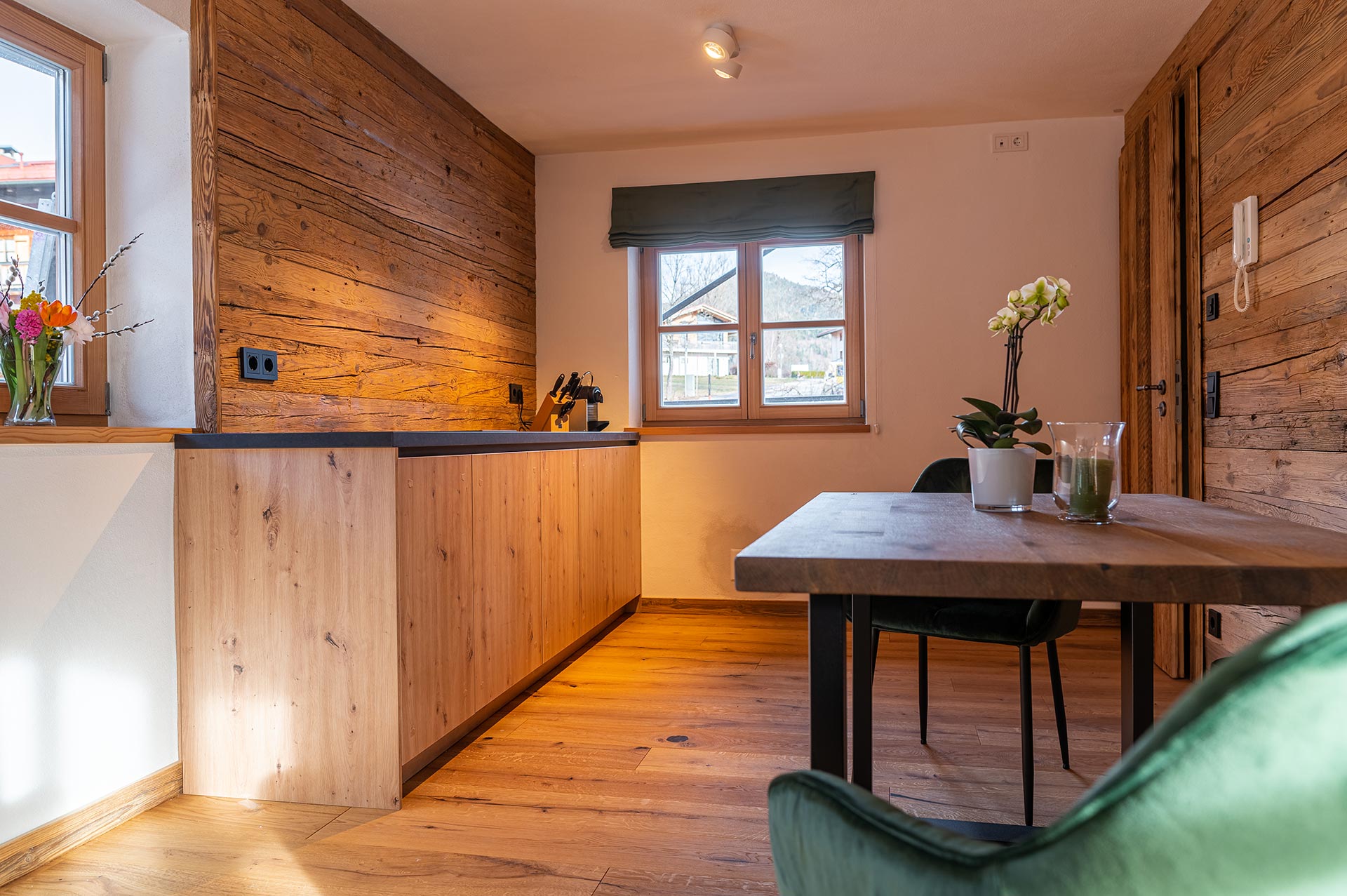 Das Appartement Winklmoos im Chalet Viol ist ca. 50m2 groß, befindet sich im Erdgeschoss und hat eine kleine Terrasse mit herrlicher Süd/West-Ausrichtung. Das Appartement verfügt über ein gemütliches Schlafzimmer mit Boxspringbett, Altholzvertäfelung, TV und einem 1,50m großen Kleiderschrank, sowie die Möglichkeit der zusätzlichen Nutzung einer Schlafcouch im Wohnzimmer. Die Wohnung hat ein schönes Bad mit Regendusche, eine kleine offene Küchenzeile mit portablen Backofen, der bei Bedarf genutzt werden kann, eine gemütliche Sitzecke mit Tisch und eine Sofaecke mit TV. Es gibt einen privaten Parkplatz vor dem Haus.