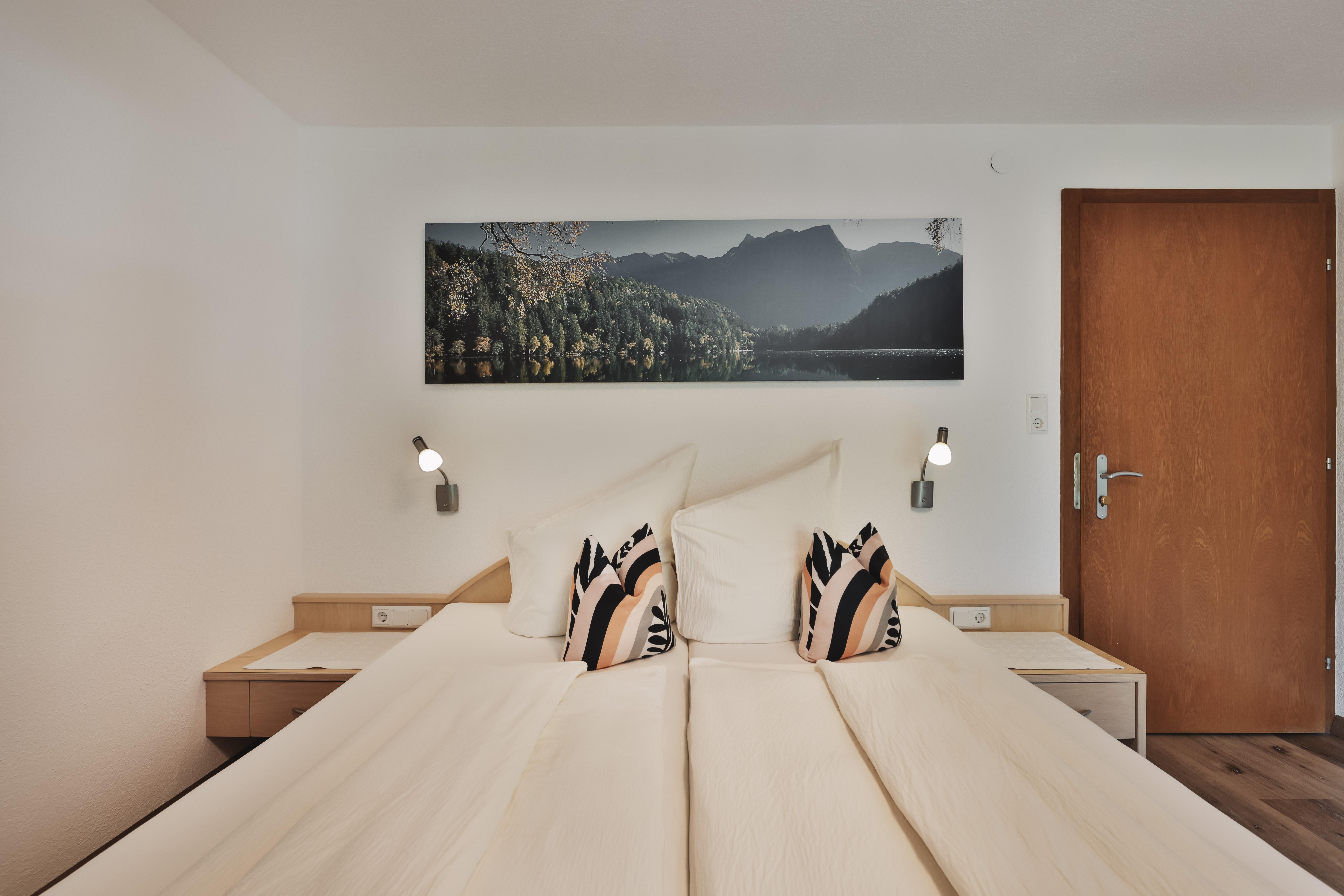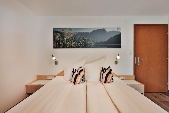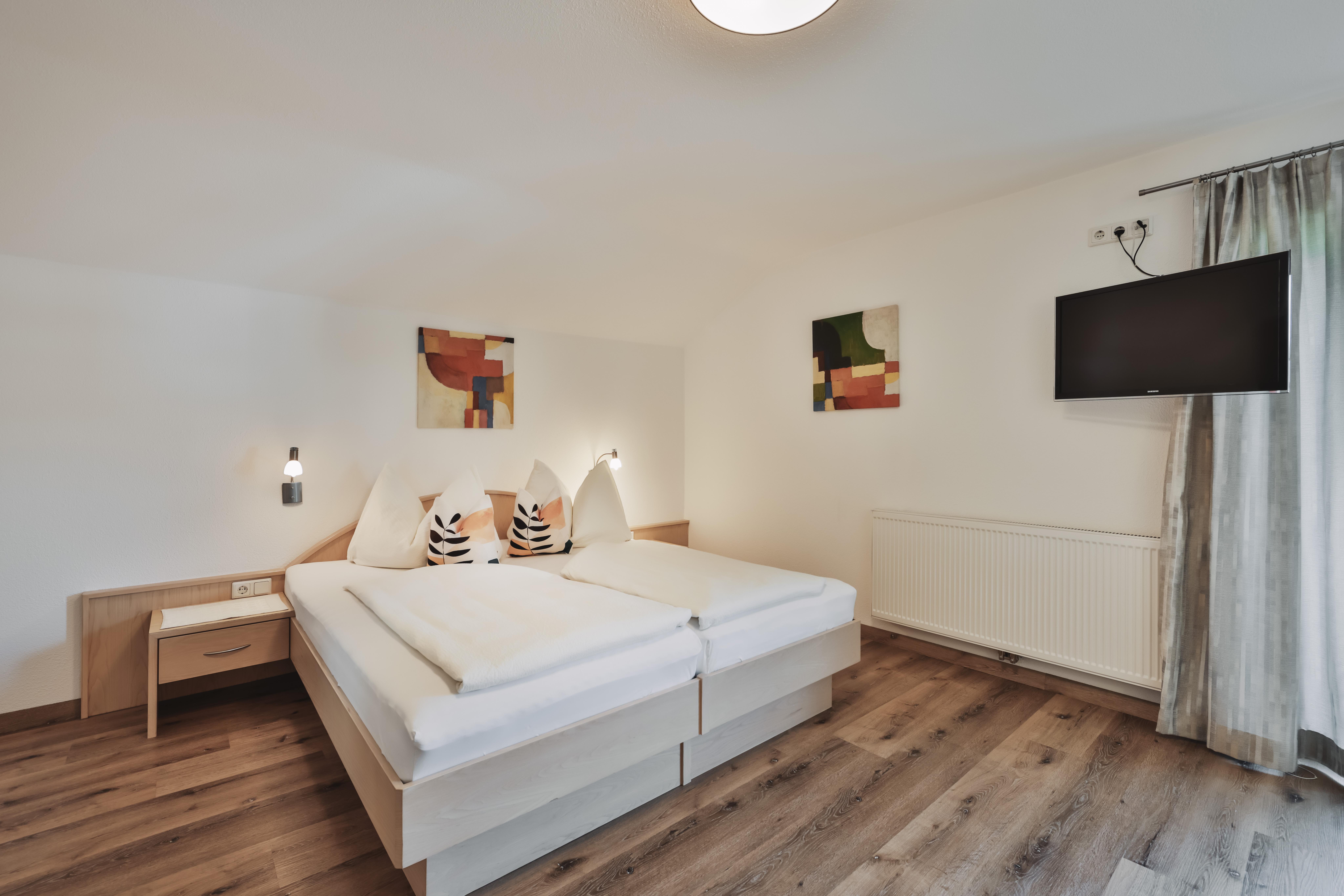 Neues, helles Doppelzimmer mit Du/WC & Balkon sowie Sat-TV, wir servieren Ihnen ein reichhaltiges Bergfrühstück.