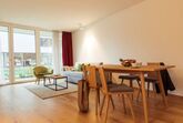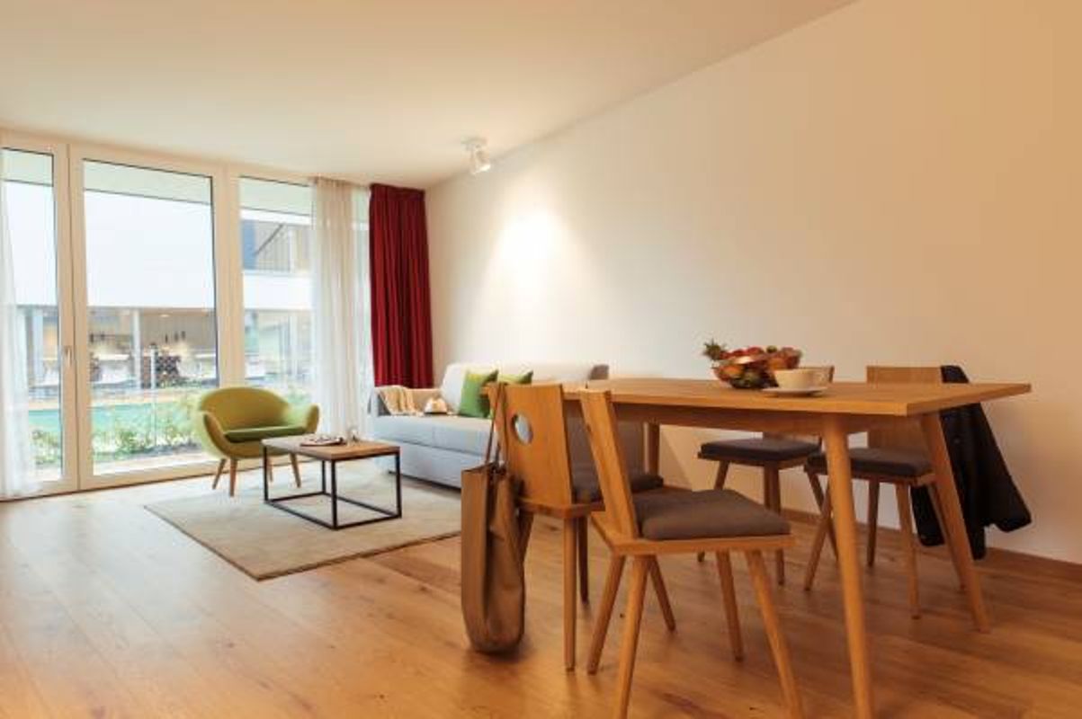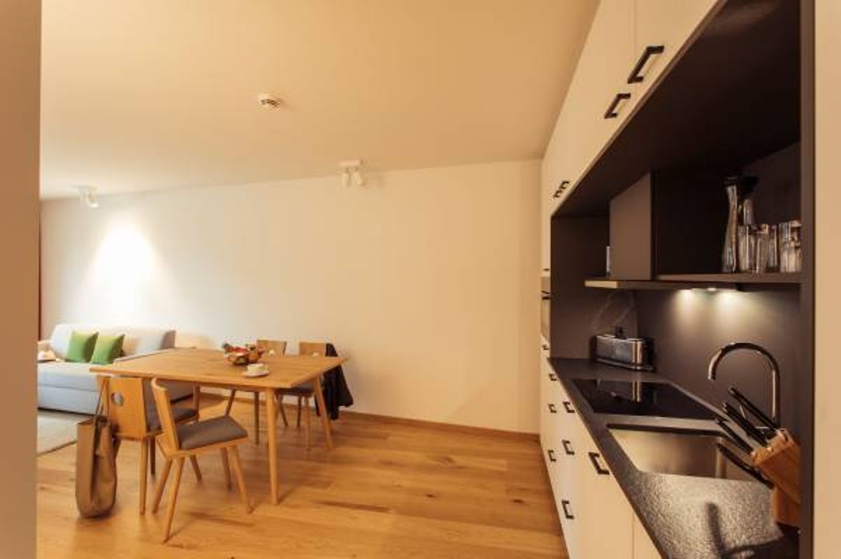 Deluxe Apartment mit ca. 72 m². Küche mit Esstisch, Parkettböden, Wohnecke mit Ausziehcouch, Sat-TV. Voll ausgestattete Küche mit Geschirrspüler, Kühlschrank, Ceran-Kochfeld, Mikrowelle, Backofen, Töpfen, Geschirr und Besteck, Kaffeemaschine, Wasserkocher, Toaster. Schlafzimmer mit Safe, 2 Bäder mit Dusche/WC, Fön. Balkon oder Terrasse.