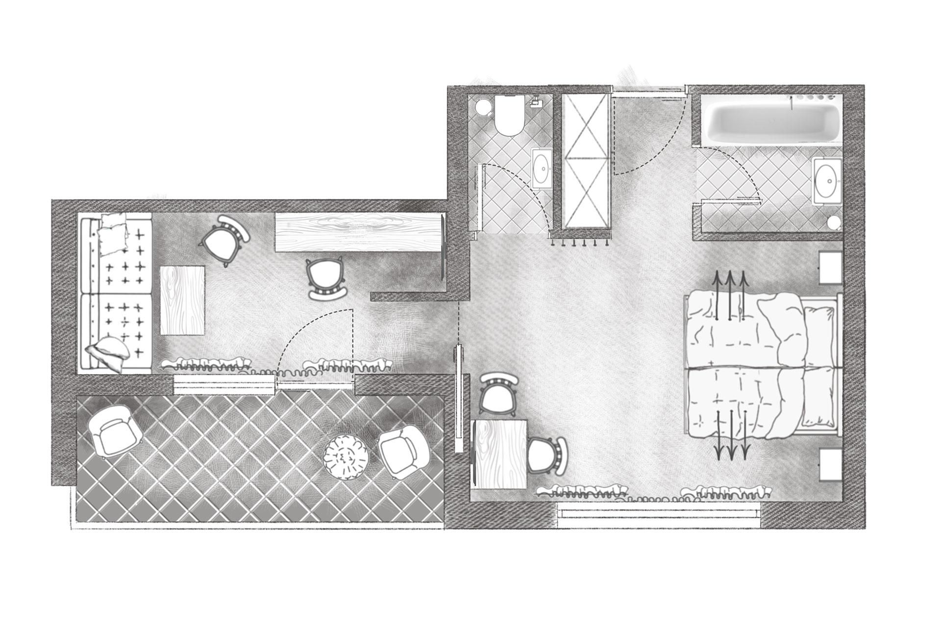 Doppelzimmer ADLER mit ca. 36 m²: 1 Doppelbett (Boxspringbett 1,8 x 2 m), Wohnecke mit 1 Sofabett für bis zu 2 weitere Personen, Balkon, Flat TV, Radio, Telefon, Safe, Badezimmer mit Badewanne und integrierter Dusche, Haarfön und separatem WC. Getrennte Betten auf Anfrage möglich.