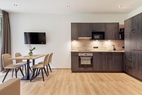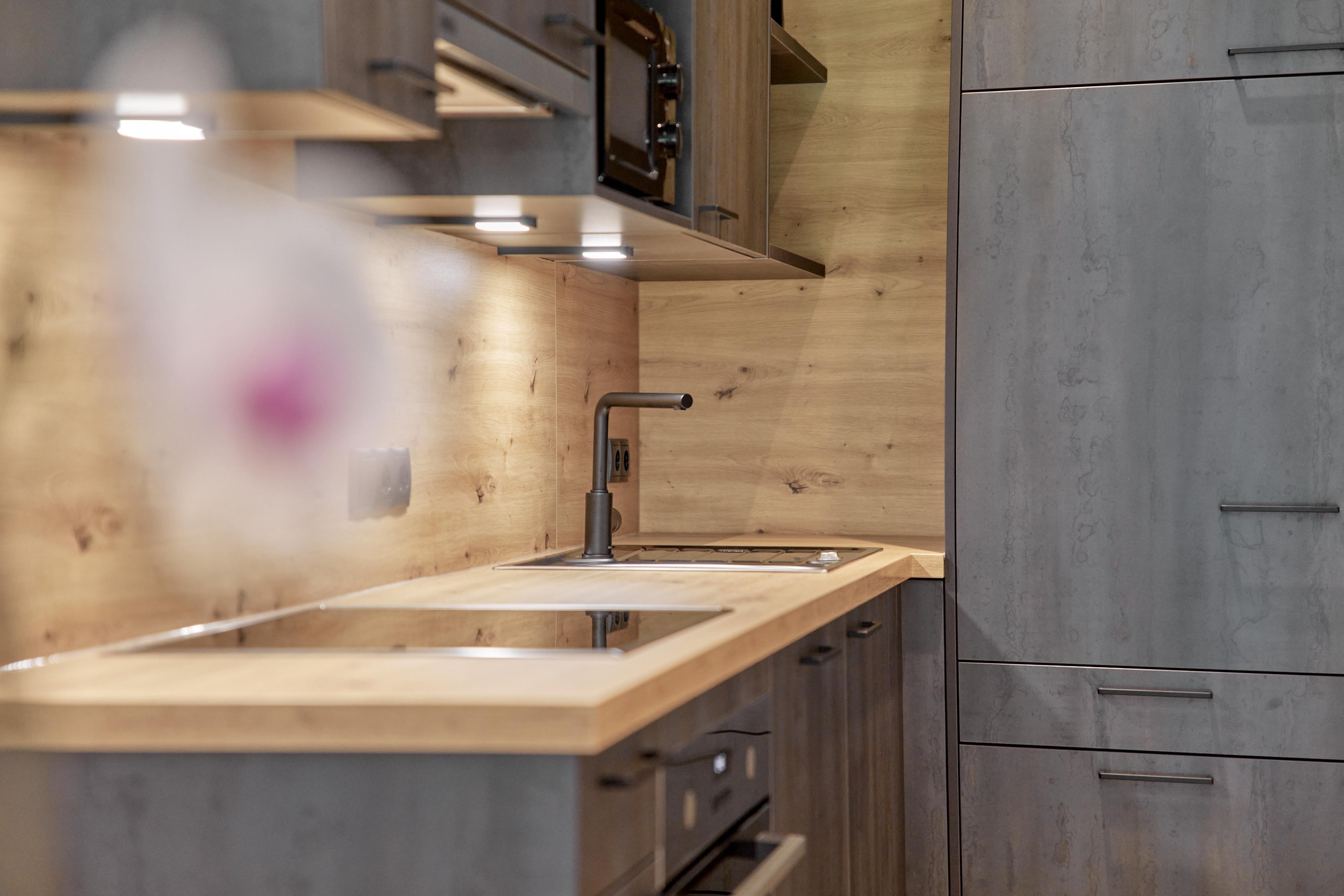 Ausstattung der Küche: Ceranfeld, Backrohr mit Pyrolyse, Kühlschrank mit Gefrierfach, Kaffeemaschine, Wasserkocher, Mikrowellenherd, Geschirrspülmaschine, Geschirr