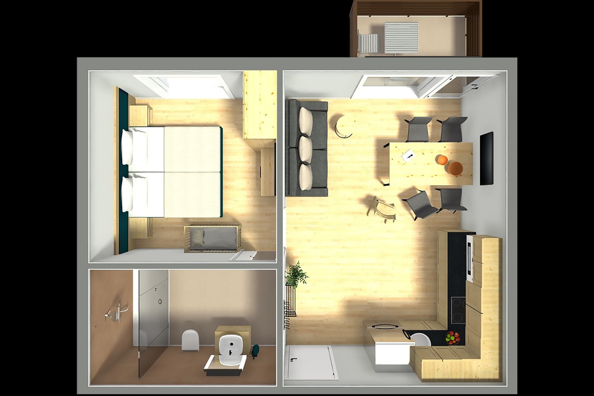 1 großzügige Wohnküche mit Essbereich, ausziehbares Sofa mit Standard - Bettgröße