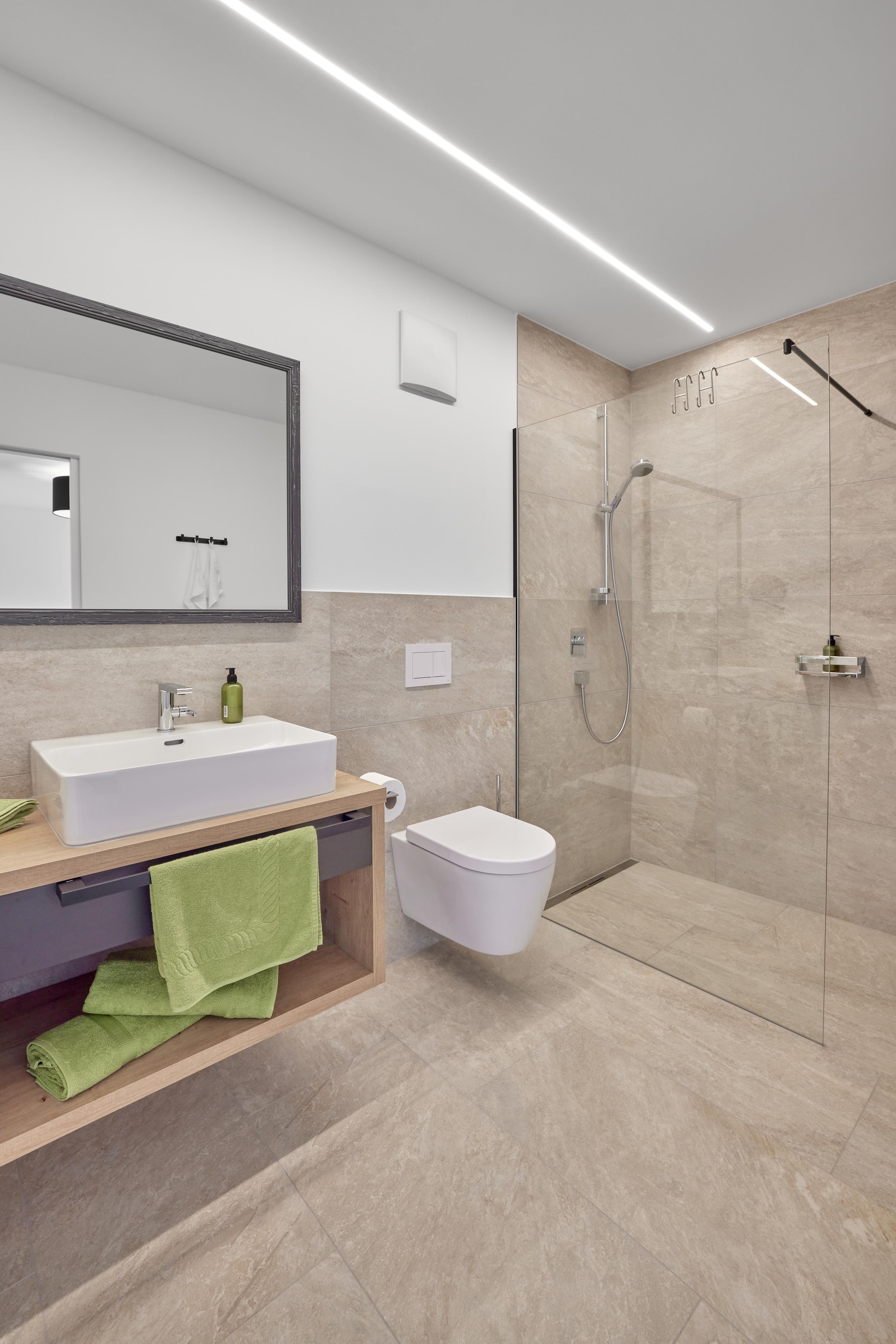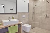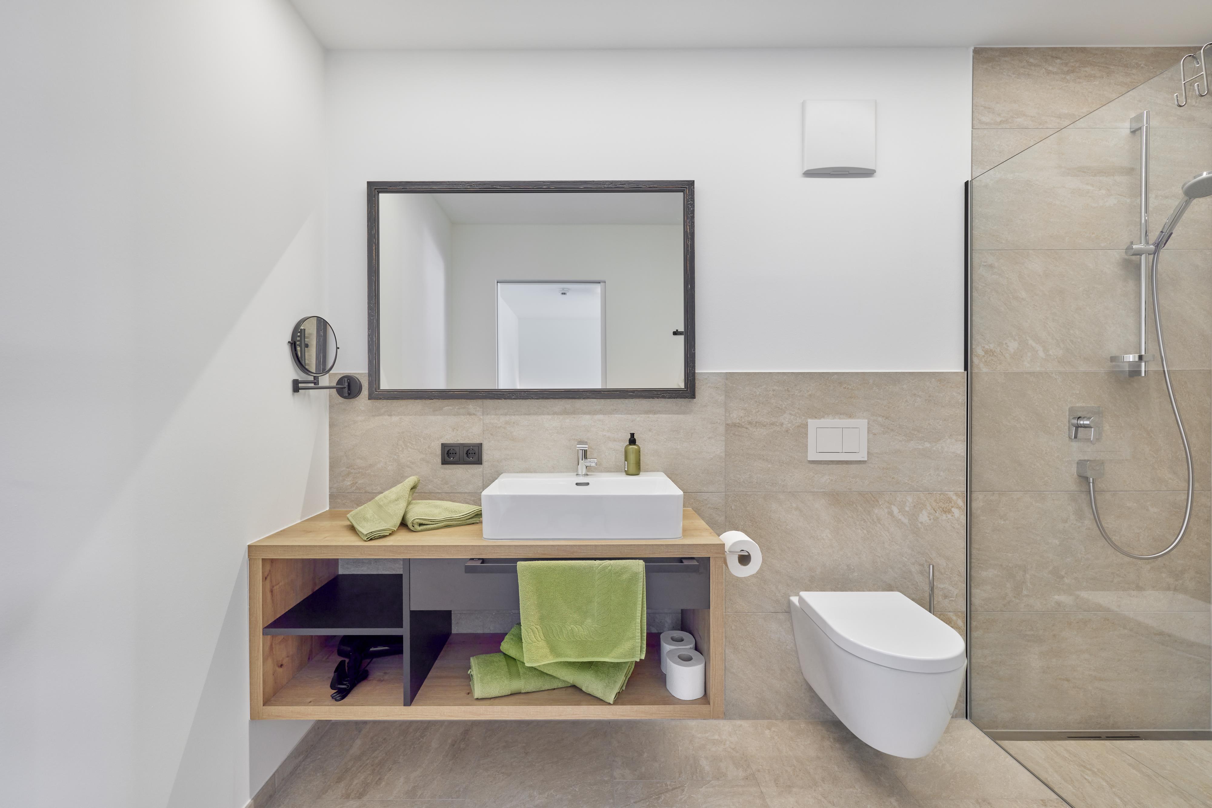1 Badezimmer mit Dusche, Handtuchtrockner, Föhn, Kosmetikspiegel