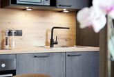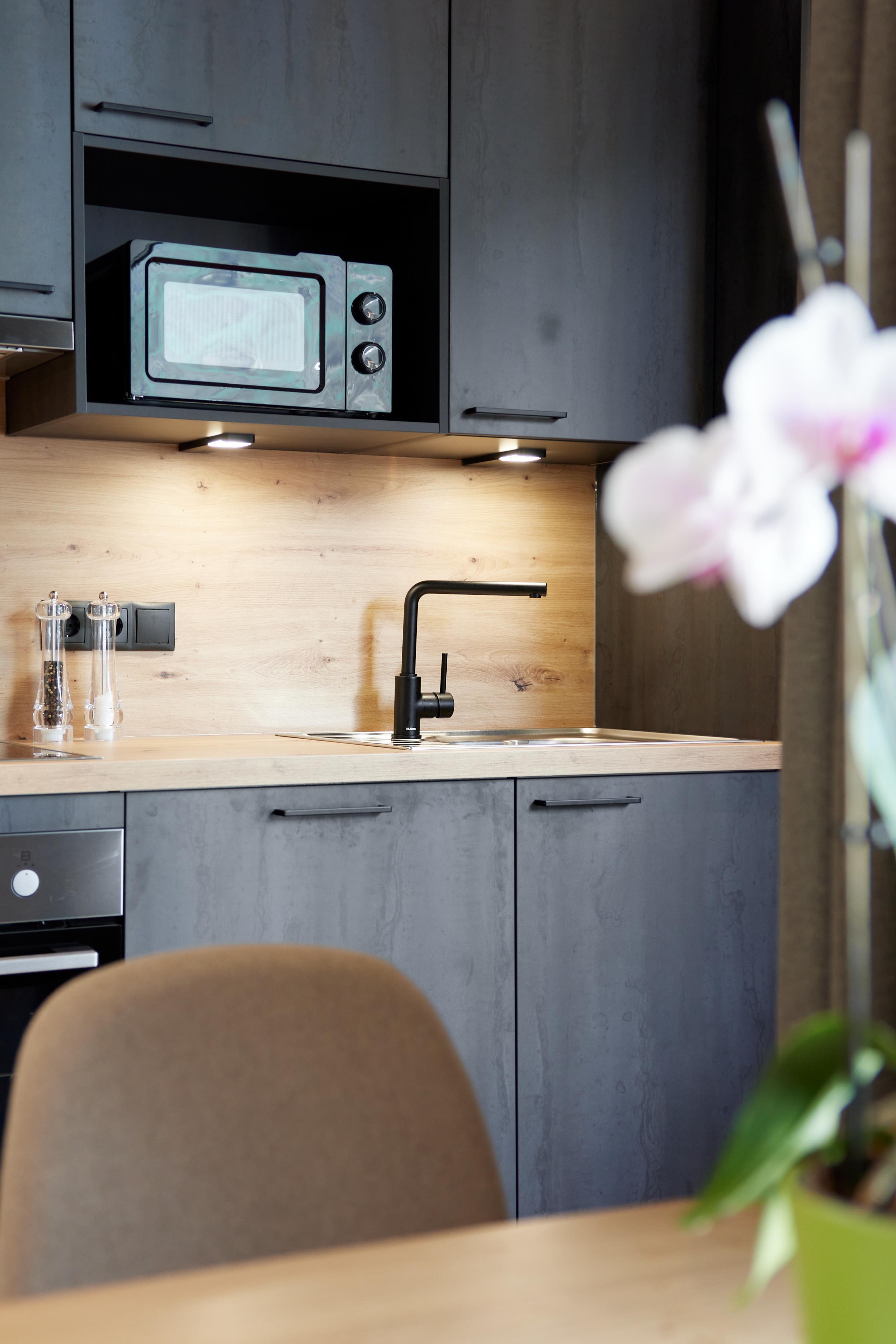 Ausstattung der Küche: Ceranfeld, Backrohr mit Pyrolyse, Kühlschrank mit Gefrierfach, Kaffeemaschine, Wasserkocher, Mikrowellenherd, Geschirrspülmaschine, Geschirr