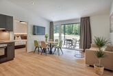 1 großzügige Wohnküche mit Essbereich, ausziehbares Sofa mit Standard - Bettgröße