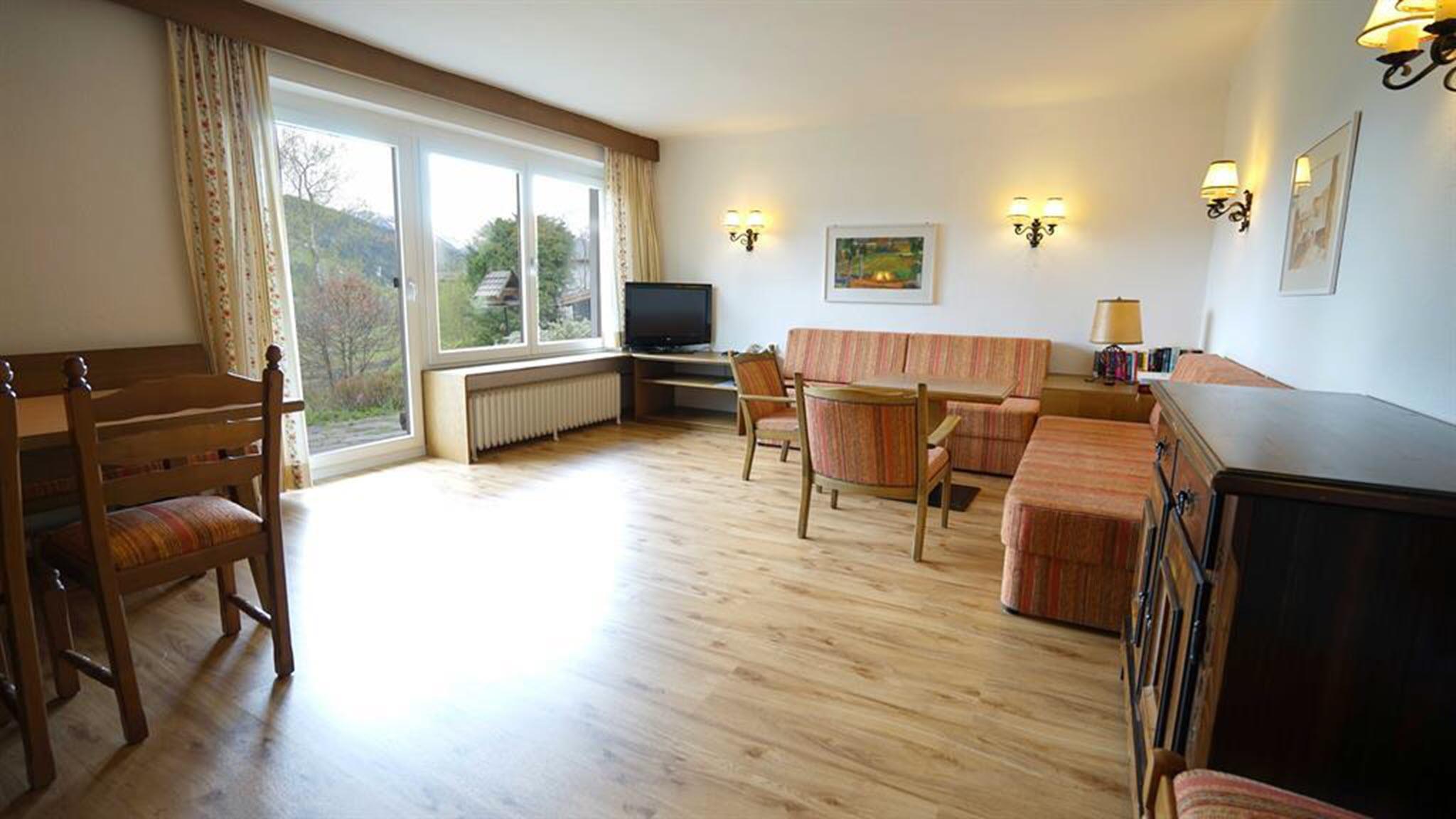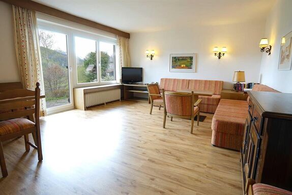 2-Raum-Appartement mit 75 m² im Parterre, Süd-Terrasse, geräumiges Wohnzimmer mit Sitz- und Essecke (2 Schlafsofas), Schlafzimmer, Küche, Badezimmer mit Dusche, WC
