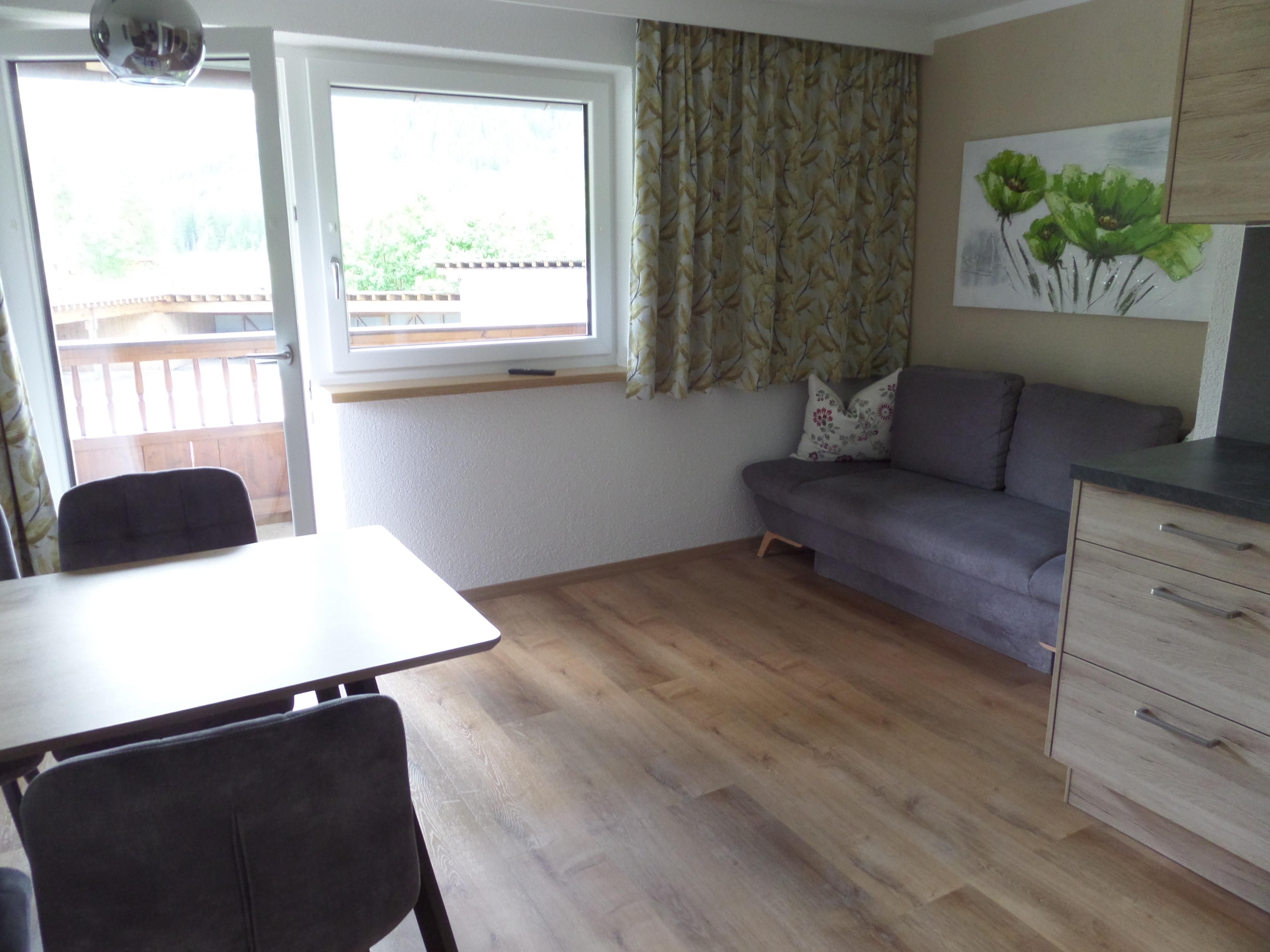 Ein Esstisch und eine Sitzcouch vervollständigen die Einrichtung. Der Balkon ist nach Westen ausgerichtet und hat Tisch und Stühle.