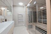 1 großzügiges Badezimmer mit eleganter Sanitärausstattung (Doppel-)Waschbecken, geräumiger Walk-In-Dusche und Infrarot Wärmekabine.