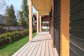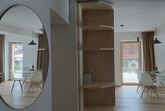 Die Ferienwohnung „Ebenerdig mit Garten“ bietet 2 große getrennte Schlafzimmer mit direktem Zugang zur Holzterrasse und Gartenfläche, die bodentiefen Fenster verbinden den Wohnbereich mit den Außenanlagen.