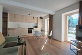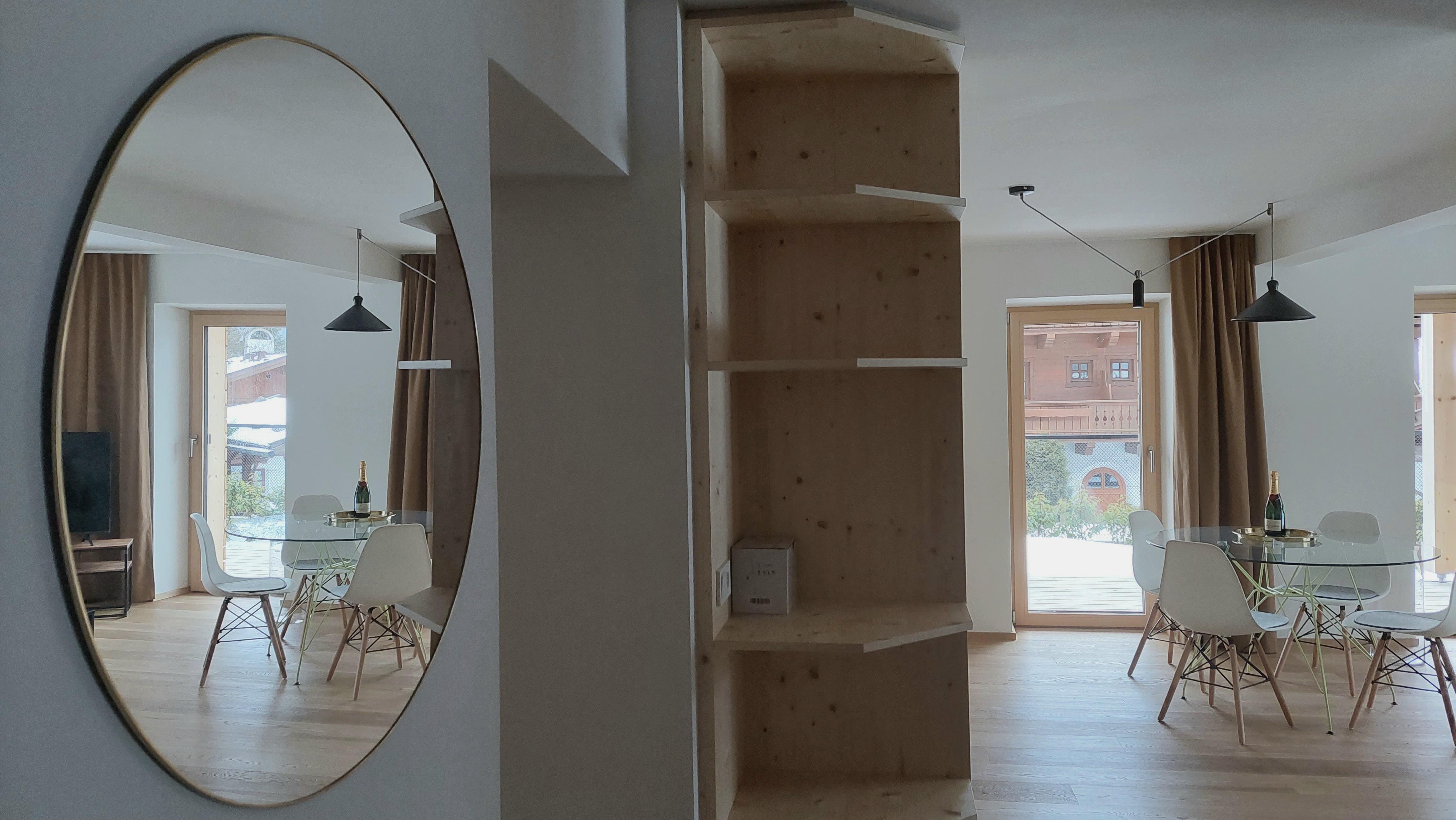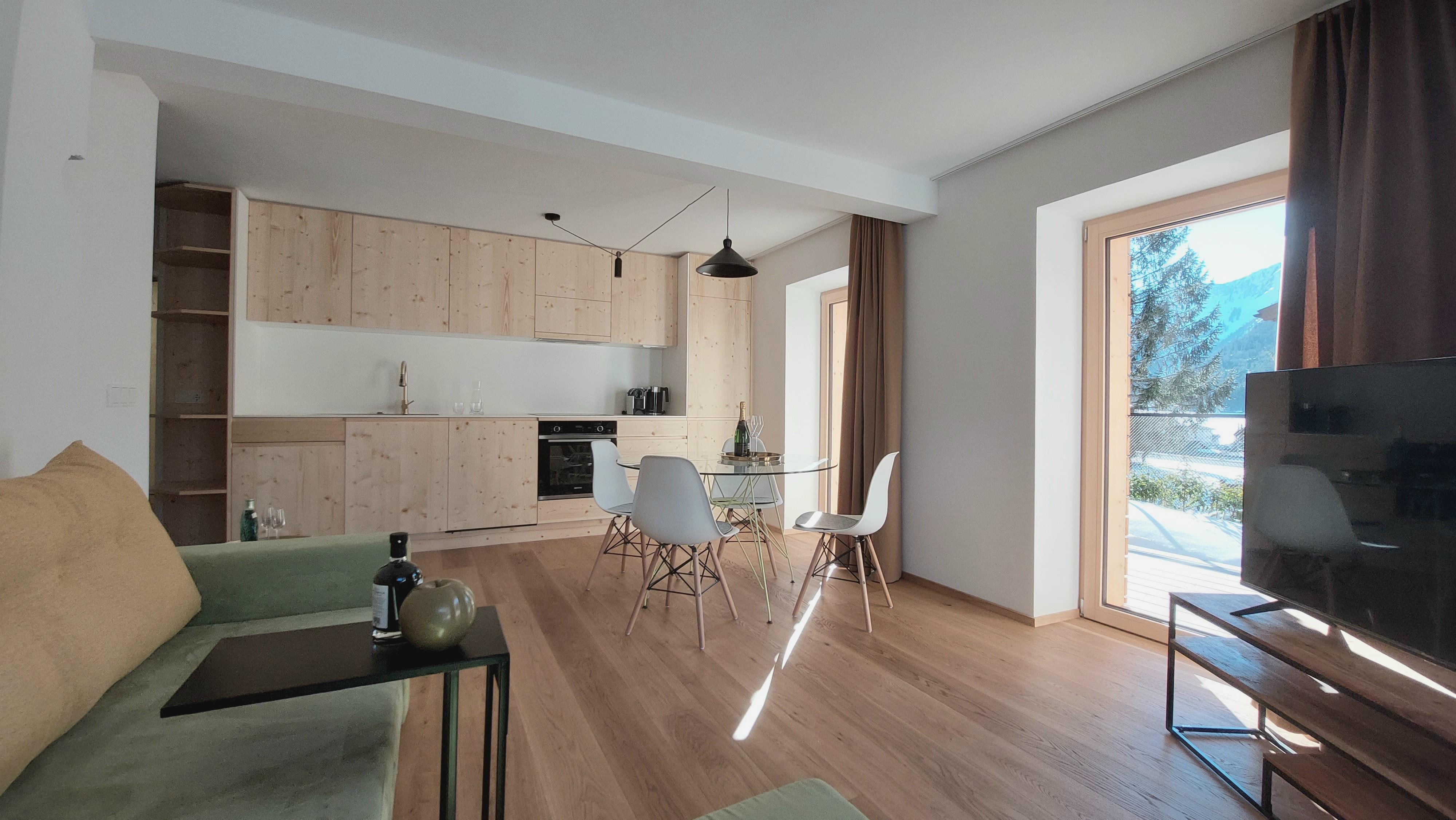 1 offener Wohn-Essbereich ausgestattet mit einer wertigen Massivholz-Tischlerküche aus einem Tiroler Meisterhand lässt in Optik und Ausstattung keine Wünsche offen. Ein runder Esstisch und die stilvolle Sitzecke vervollständigen die behagliche Atmosphäre. Ein Flat-TV Gerät sorgt für Unterhaltung zwischendurch.