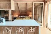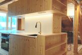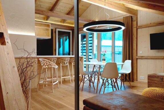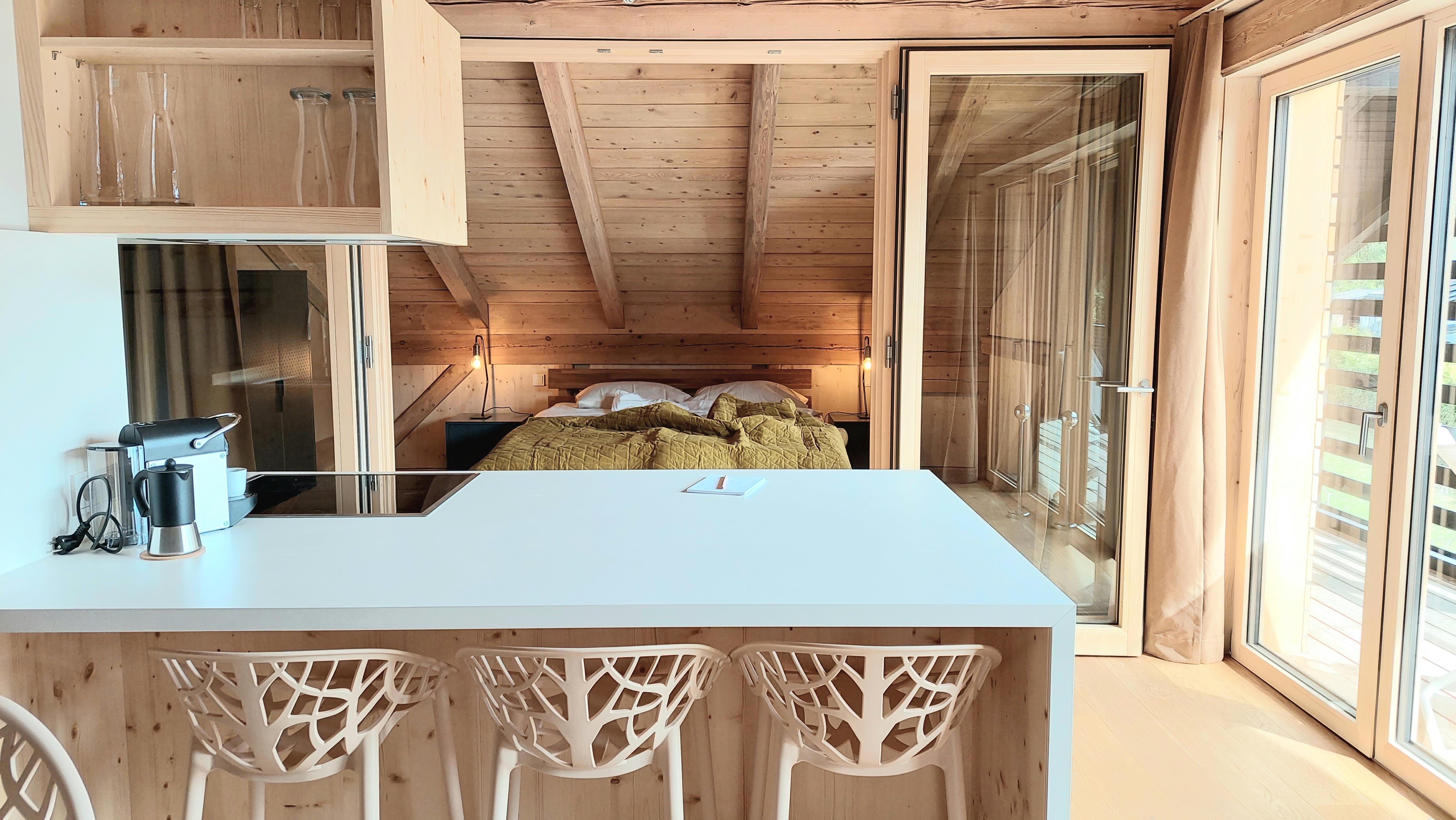 1 offenen Wohn-Ess- und Schlafbereich ausgestattet mit einer wertigen Massivholzküche von einem Tiroler Meisterhandwerker, die in Optik und Ausstattung keine Wünsche offenlässt.