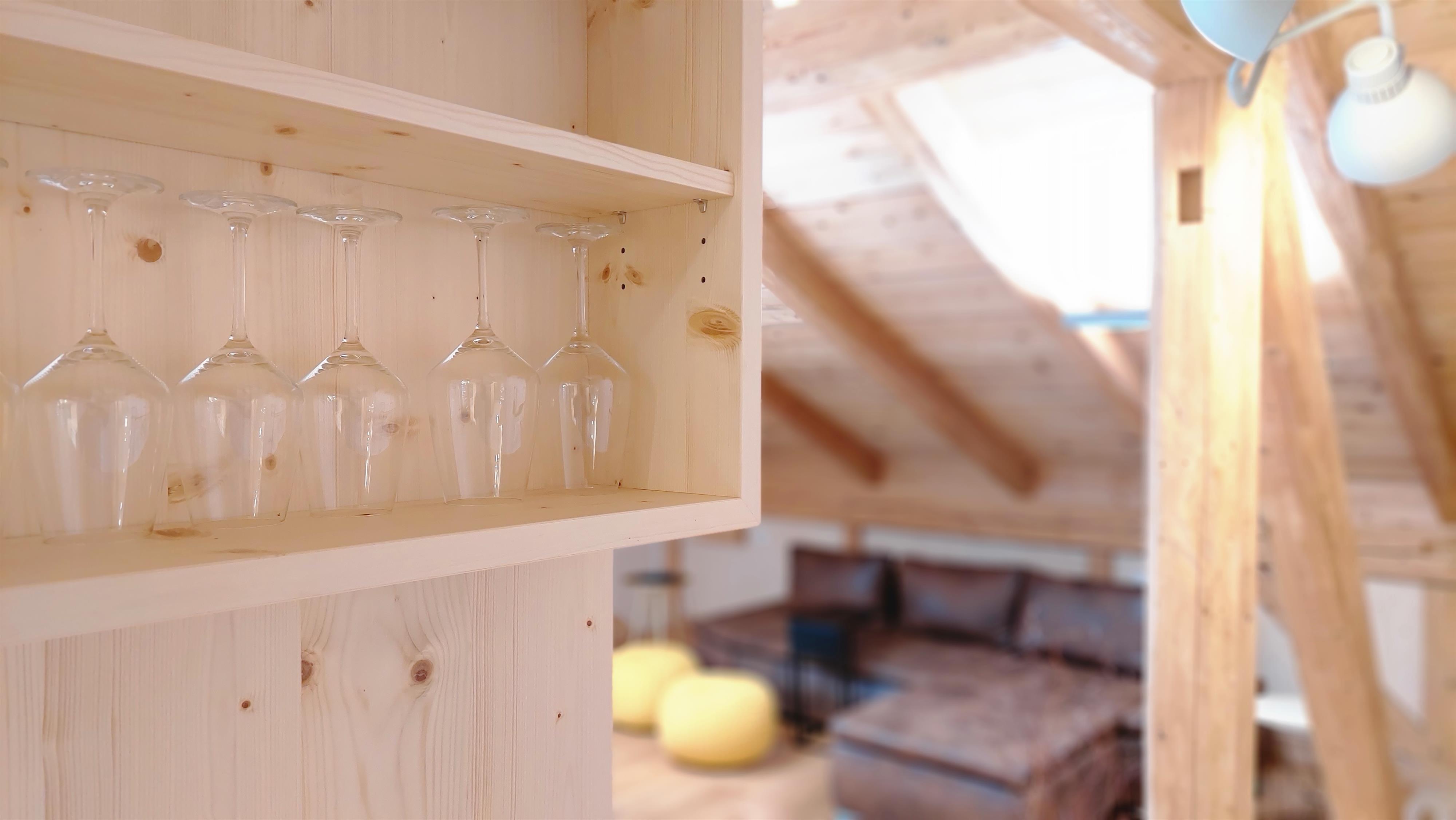 Genießen Sie den Charm des „rustikalen Penthouses“ mit den maximalen Sonnenstunden, einer Überhöhe unter dem alten First sowie einem offenen Badezimmerbereich. Das alles unter dem Dach, errichtet in ehrlicher Bodenständigkeit durch die Erbauer der Kranzmuehle.