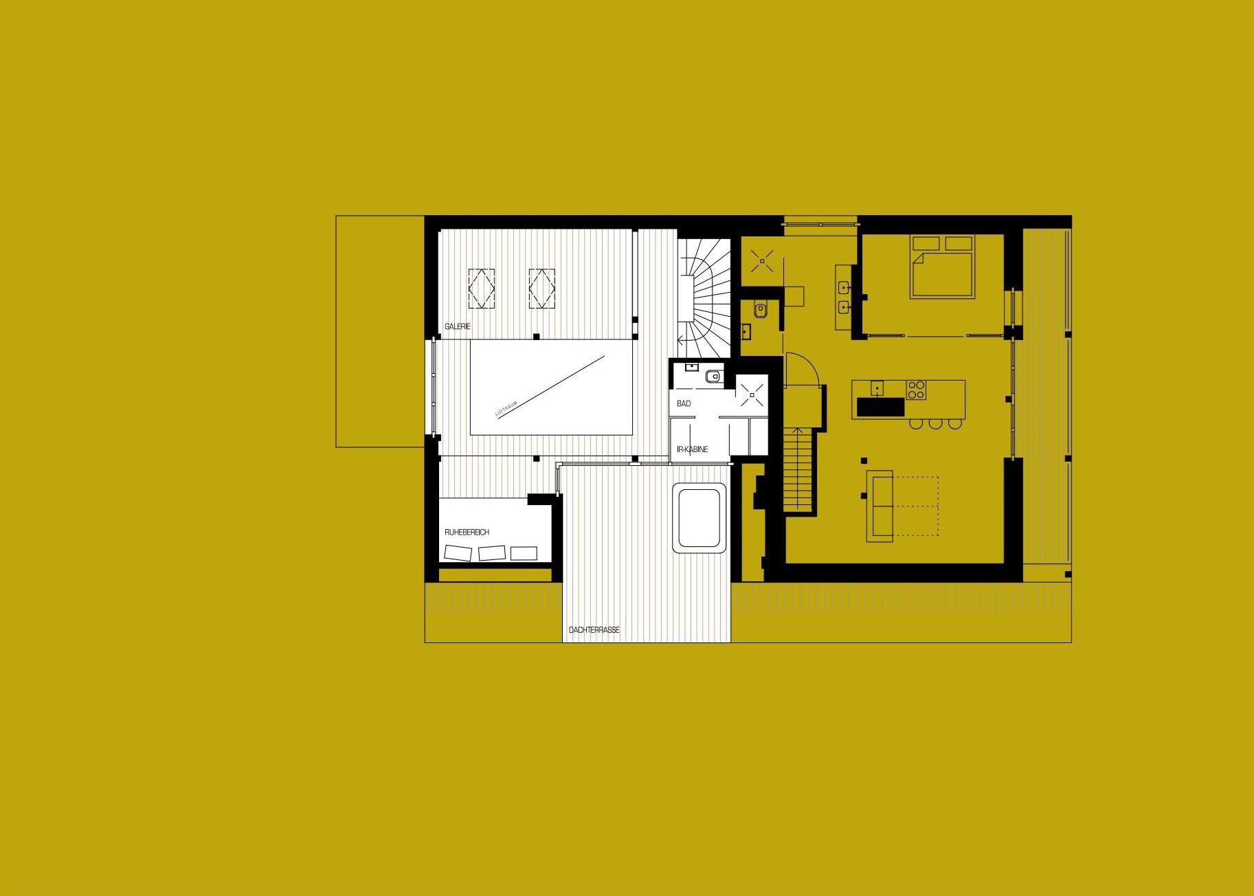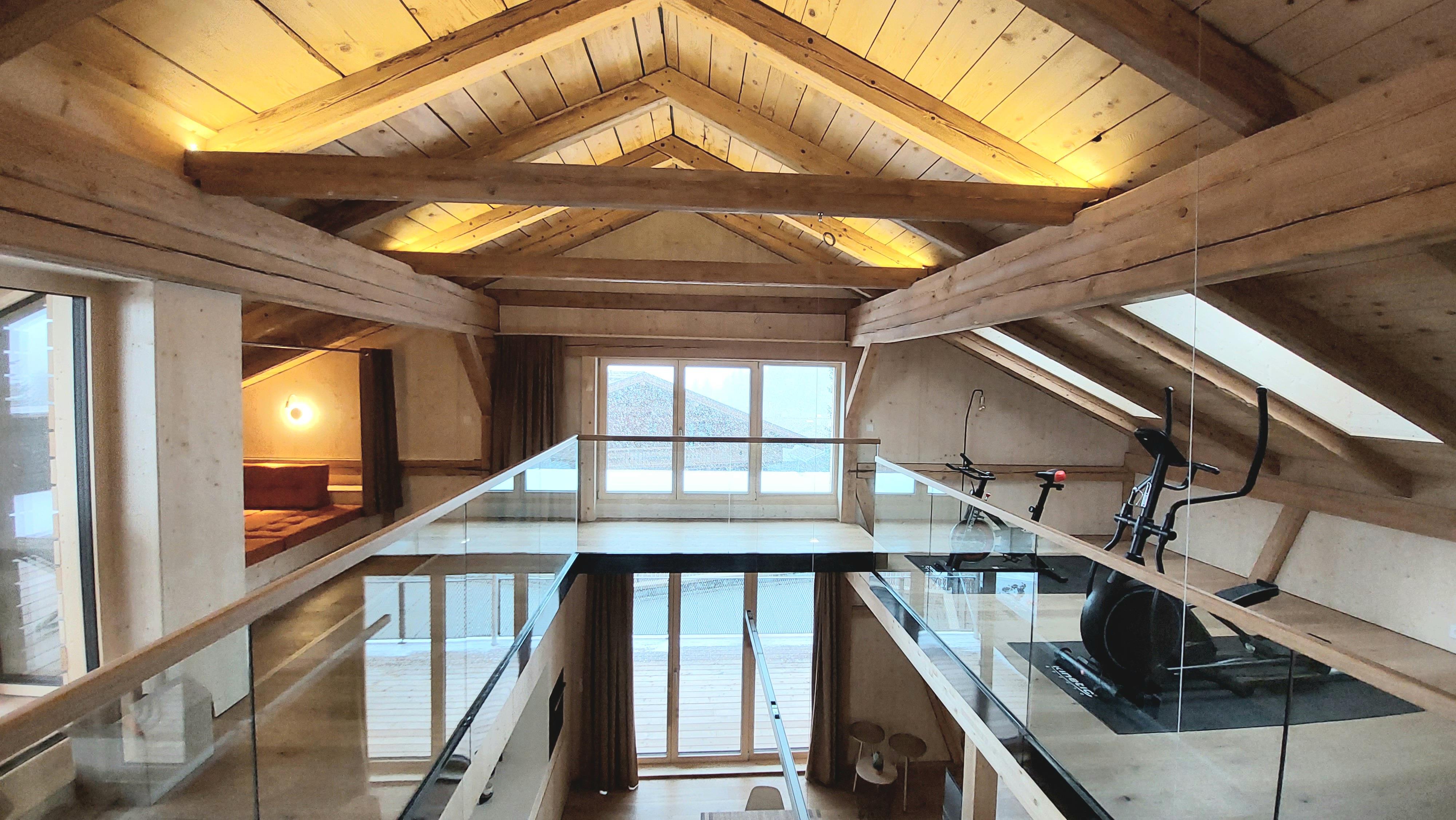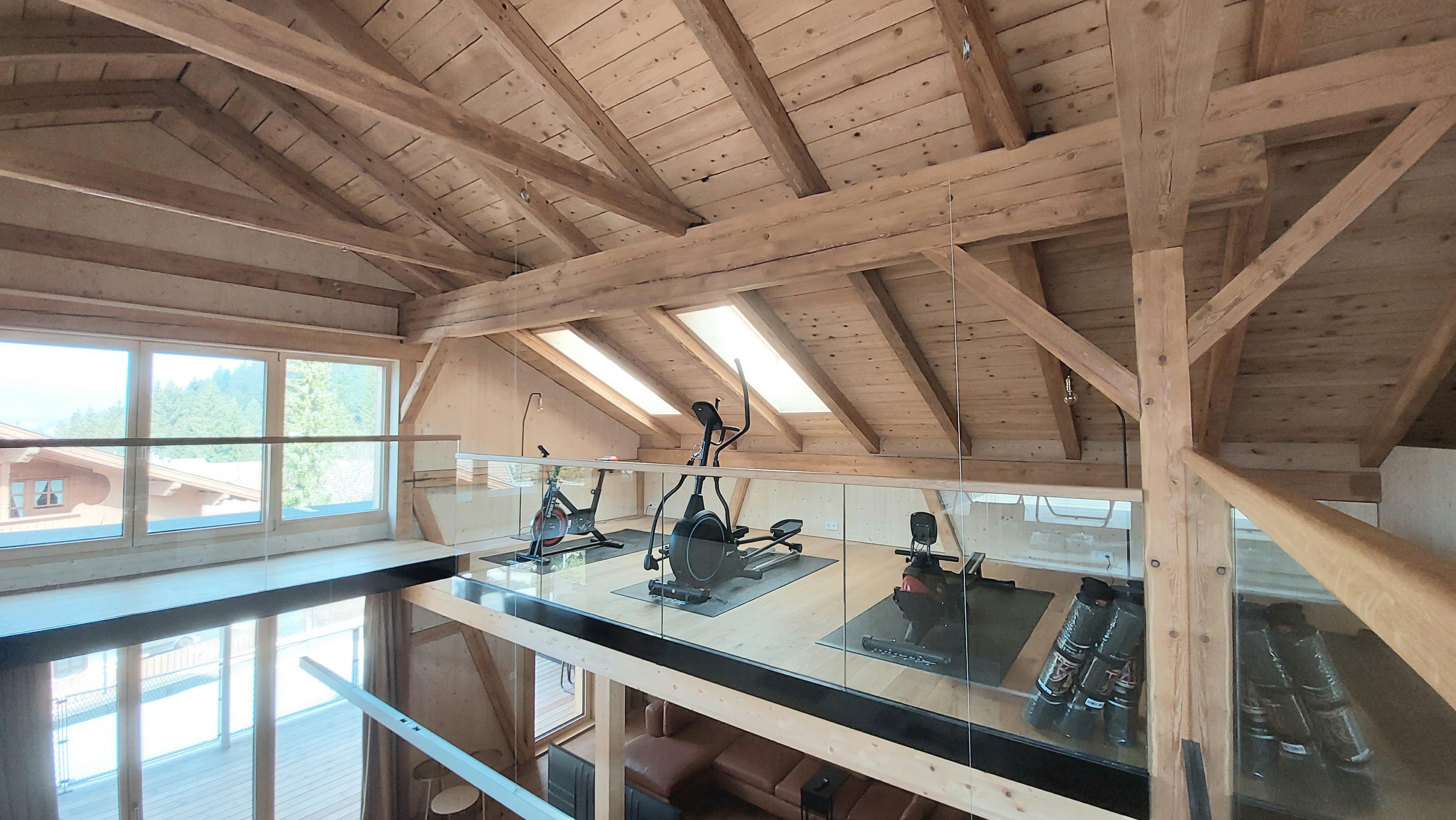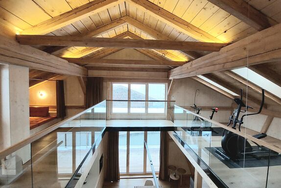 Ein paar Stufen führen weiter zum nächsten Highlight: die Galerie, perfekt dazu geschaffen, die Seele baumeln zu lassen, einen Bestseller zu verschlingen oder ein unaufschiebbare „berufliche Dinge“ zu erledigen. Ein zusätzliches Bad, eine Infrarot-Kabine mit Blick auf das Karwendelgebirge und ein „hyggeliges“ Kuschelnest unter der Dachschräge lassen energiespendende PRIVAT-Spa-Stunden zu, um sich auch wirklich wie im Himmel zu fühlen.
