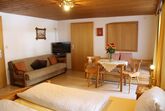 Wohnküche mit Sitzecke, Schlafsofa, Essplatz, SAT-TV sowie großer Balkon mit Liegestühlen und Sitzgelegenheit.