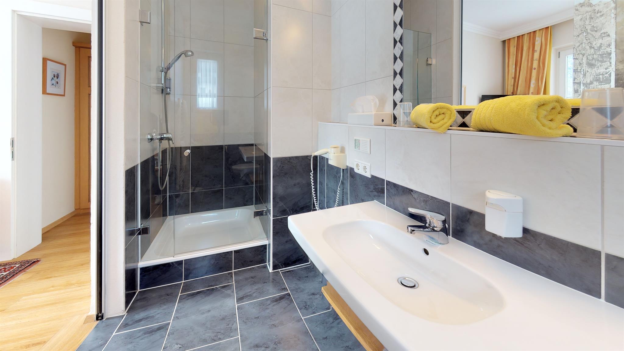 Das 15m² große Doppelzimmer ist ausgestattet miti Dusche, WC, Sitzecke, Sat-TV und Balkon.