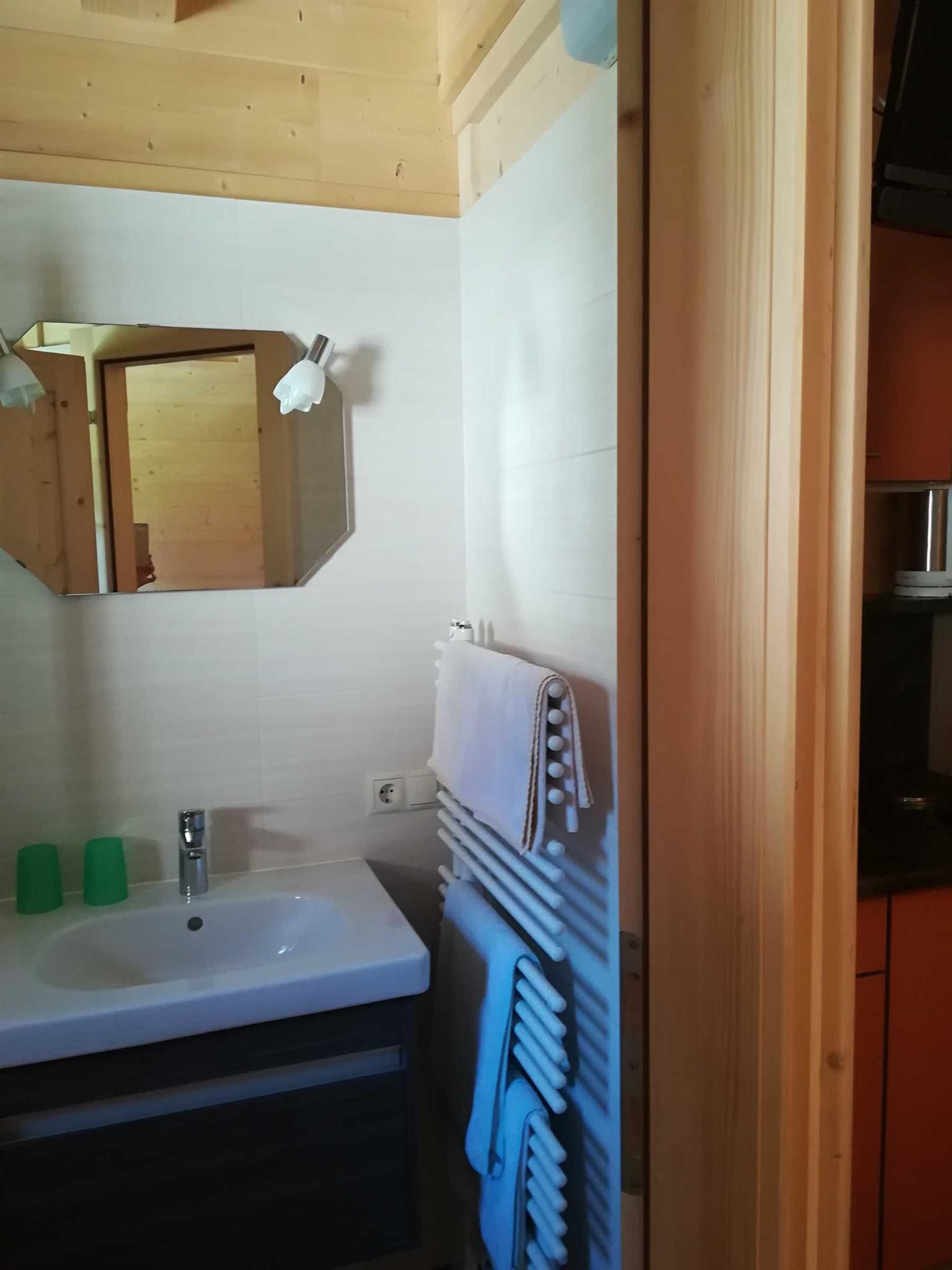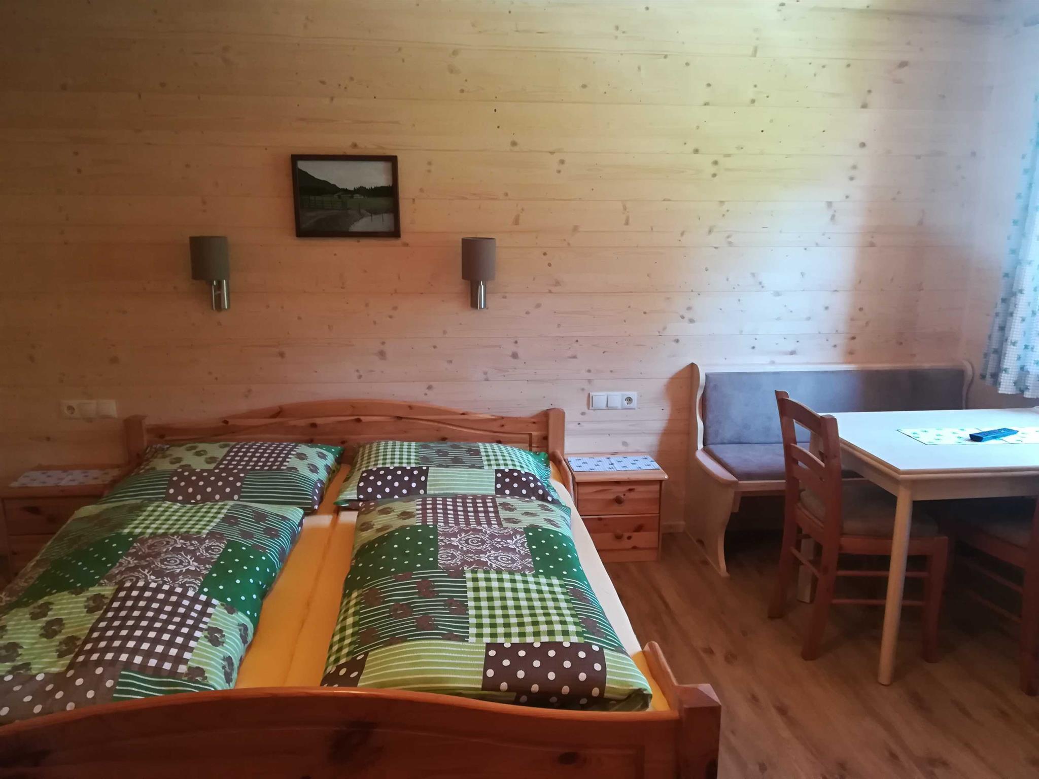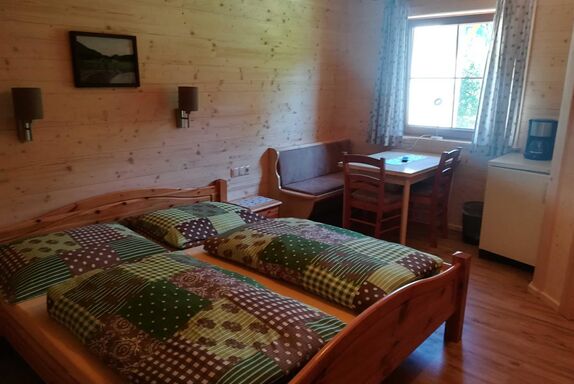 Gemütliches Doppelzimmer im Tiroler Holzhausstil, mit kleiner Kochmöglichkeit, Essecke, Kühlschrank, TV und Bad mit Dusche und WC.