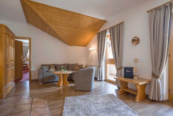 Ein Schlafzimmer mit Doppelbett, ein Schlafzimmer mit Einzelbett, zwei Badezimmer mit WC, Vorraum, Wohnraum mit ausziehbarer Doppelcouch und Balkon. Genießen Sie dazu noch den unvergleichlich schönen Blick auf die umliegenden Berge mit Zwölferkopf und Karwendel-Bergbahn.