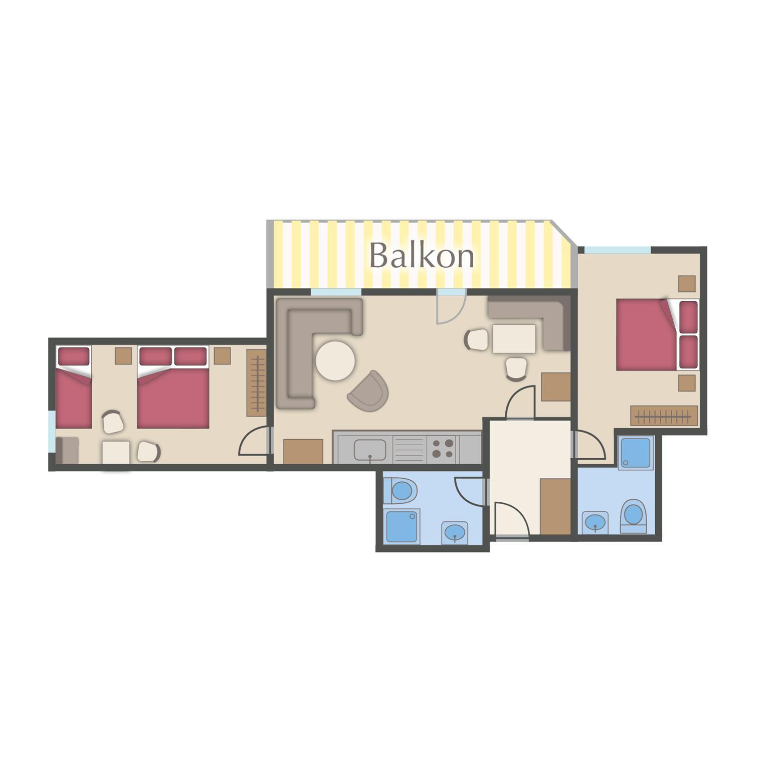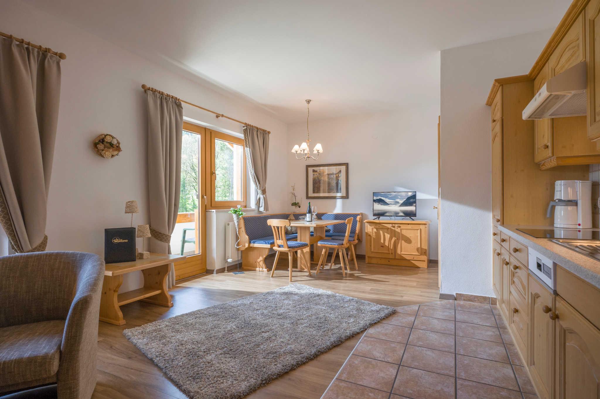 Alle Appartements bieten Wohnkomfort mit 4-Sterne-Anspruch und sind behaglich, stilvoll eingerichtet. Die Wohnungen sind ausgestattet mit einem großen Wohnraum mit Essecke, einer komplett ausgestatteten Küchenzeile (E-Herd, Mikrowelle, Kühlschrank, Geschirrspüler, Teekocher, Kaffeemaschine, Toaster, Geschirr etc.), einem Badezimmer mit Dusche, teils separates WC, Flat-TV, SAT, Telefon, CD-Player, Radio, Safe sowie einem Balkon oder Terrase teils mit Panoramablick.