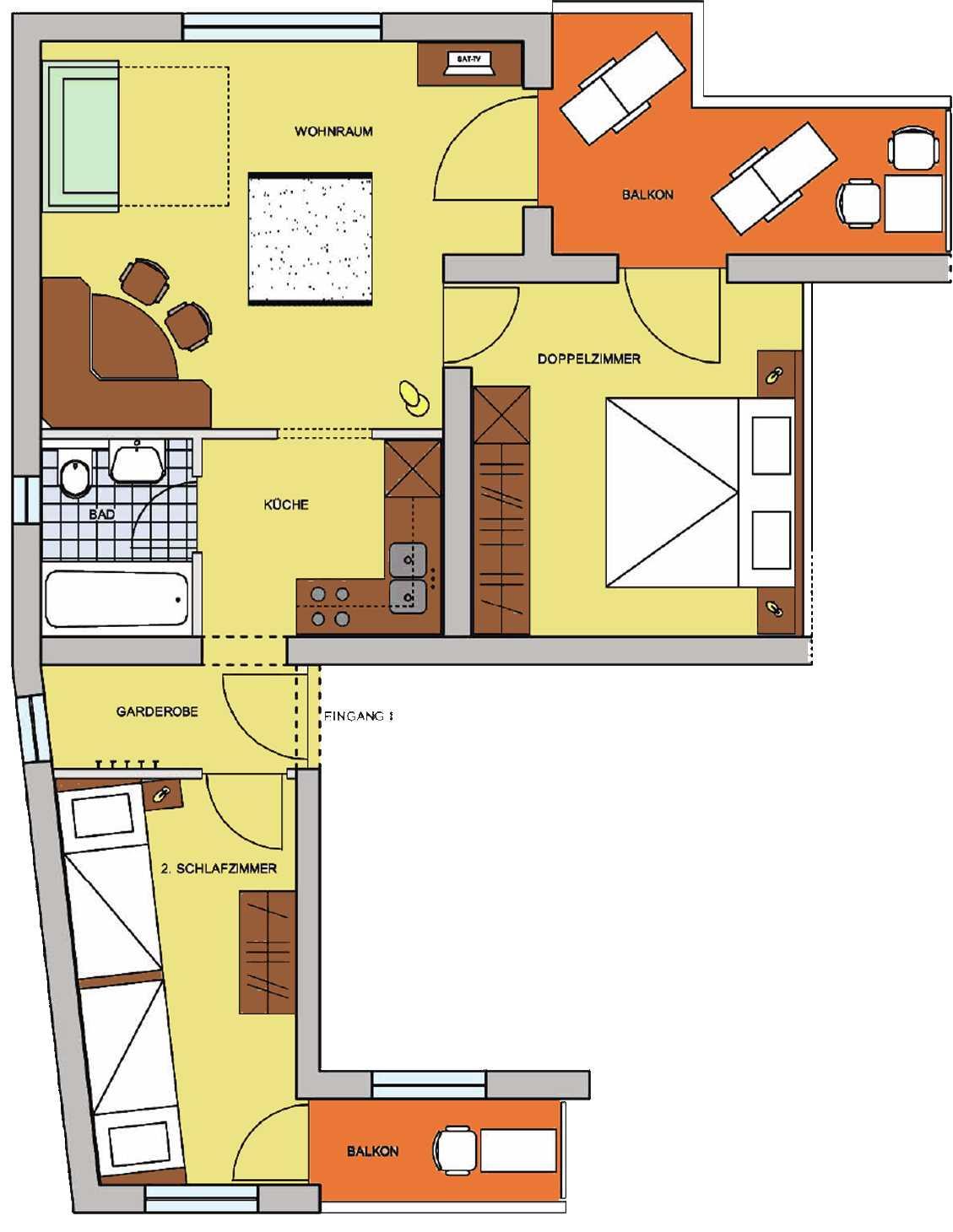 • Balkon Richtung Osten, vom Doppelzimmer und vom Wohnraum aus erreichbar und Balkon Richtung Westen, vom Zweibettzimmer aus erreichbar