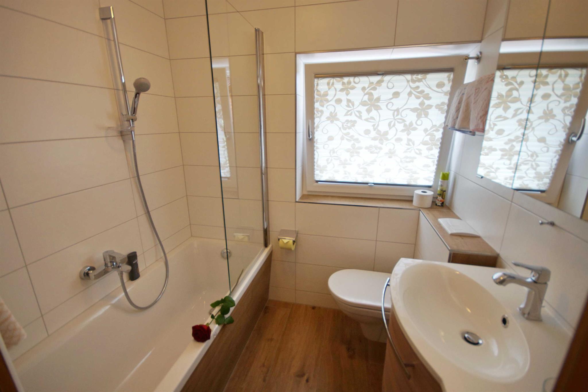 Unser kleineres Appartement NESTL/Mansarde mit 1 extra Schlafzimmer ist durch seinen besonderen Charme sehr beliebt, das Badezimmer hat eine Dusche extra und eine Sitz-Badewanne, Balkon zum Sitzen