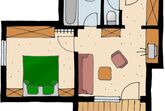 Landhausappartement mit ca. 38 m², Wohnschlafzimmer mit Sofa und Kachelofen, getrenntes Schlafzimmer, teils Balkon, Badezimmer mit Badewanne, WC separat, Fön, Bademäntel, Radio, Telefon, Kabel-TV, Safe.