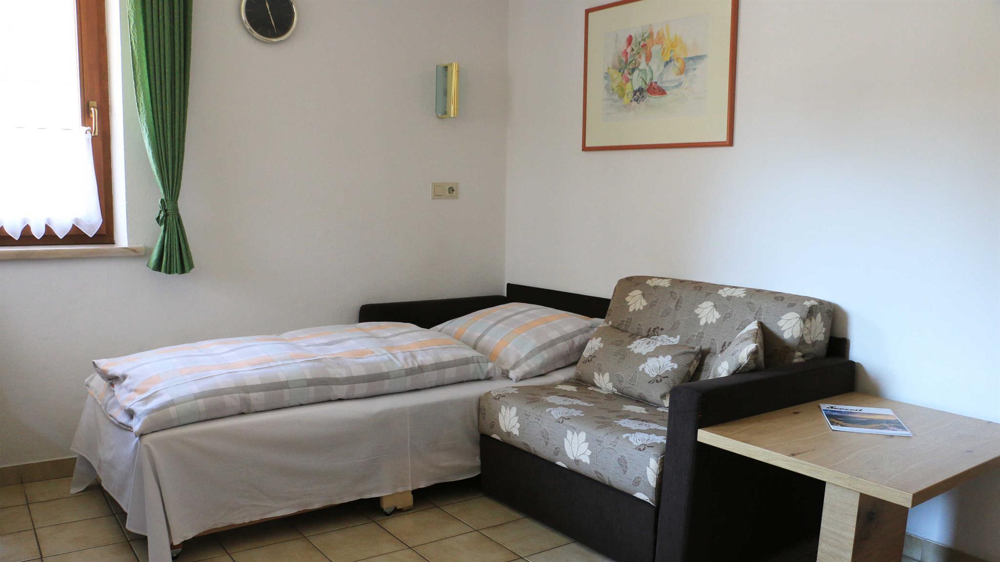 Die gemütliche Ferienwohnung besteht aus einem Schlafraum, Badezimmer, Wohnküche und kleinem Vorraum.