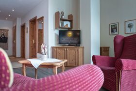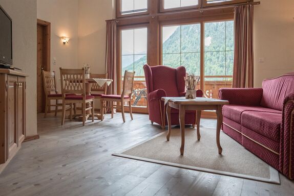 Großzügige Suite im 3. Stock mit Panoramafenstern. Diese Suite ist ausgestattet mit eine Wohn-Schlafzimmer & einem separaten Schlafzimmer (LED HD Flachbildschirmfernseher, Dusche und/oder Badewanne). Im Bad liegen Duschlotion & Tiroler Steinöl Handseife auf.