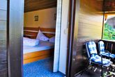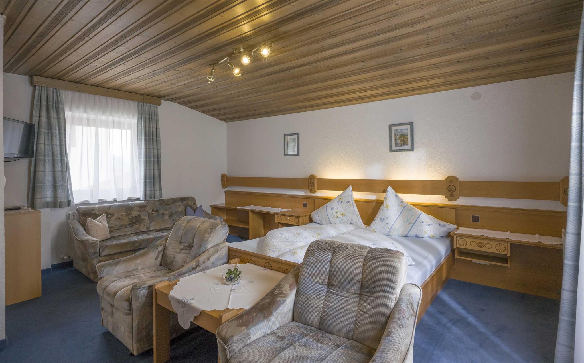Doppelzimmer mit Wohnecke und Couchliege im 1. Stock, 1 Schlafzimmer mit Doppelbett und ausziehbarer Doppelschlafcouch, Dusche/WC inklusive Föhn, Balkon Richtung Westen, Safe, Mini-Kühlschrank, TV-Flachbild, SAT-TV, Radio, kostenloses W-LAN, kostenloser Parkplatz vorhanden, Frühstück inklusive. Es gibt eine kleine separate Gästeküche im Erdgeschoss verfügbar mit Kühlschrank, Herdplatten und Wasserkocher. Aufenthaltsraum/Frühstücksraum gegenüber benutzbar.