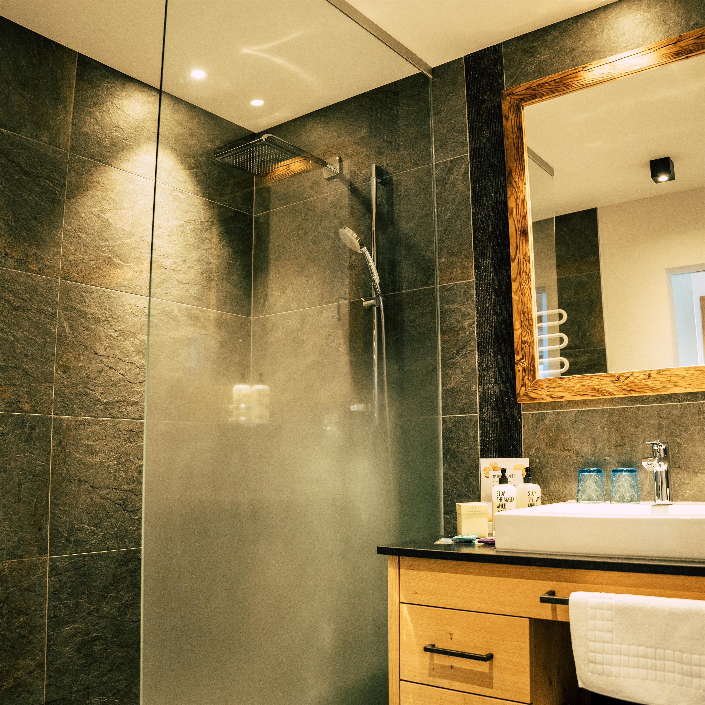 Bad mit begehbarer Dusche, Handtuchtrockner, Kosmetikspiegel, Fön, WC, flauschige