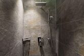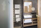 Bad mit begehbarer Dusche, Handtuchtrockner, Kosmetikspiegel, Fön, WC, flauschige