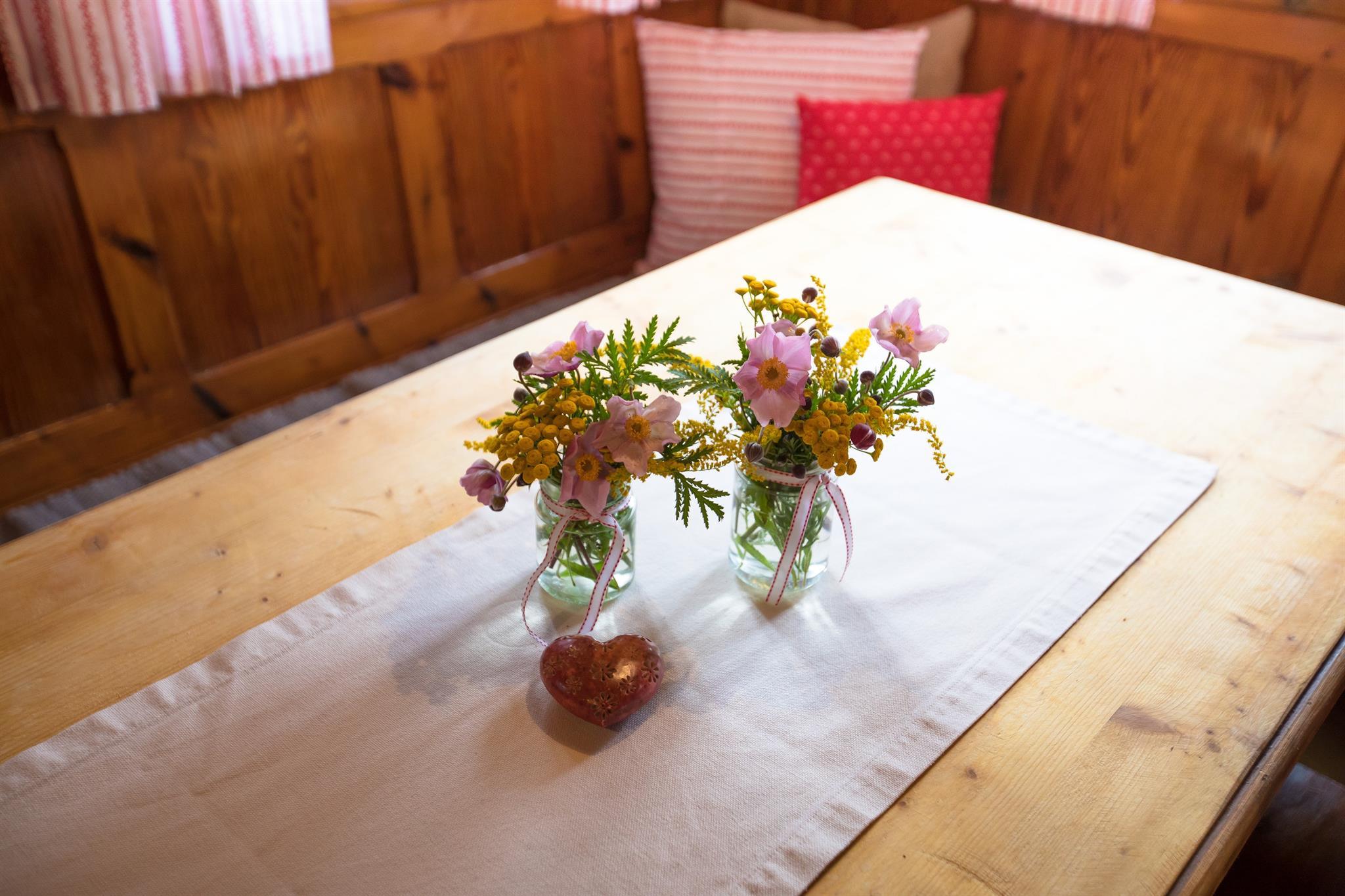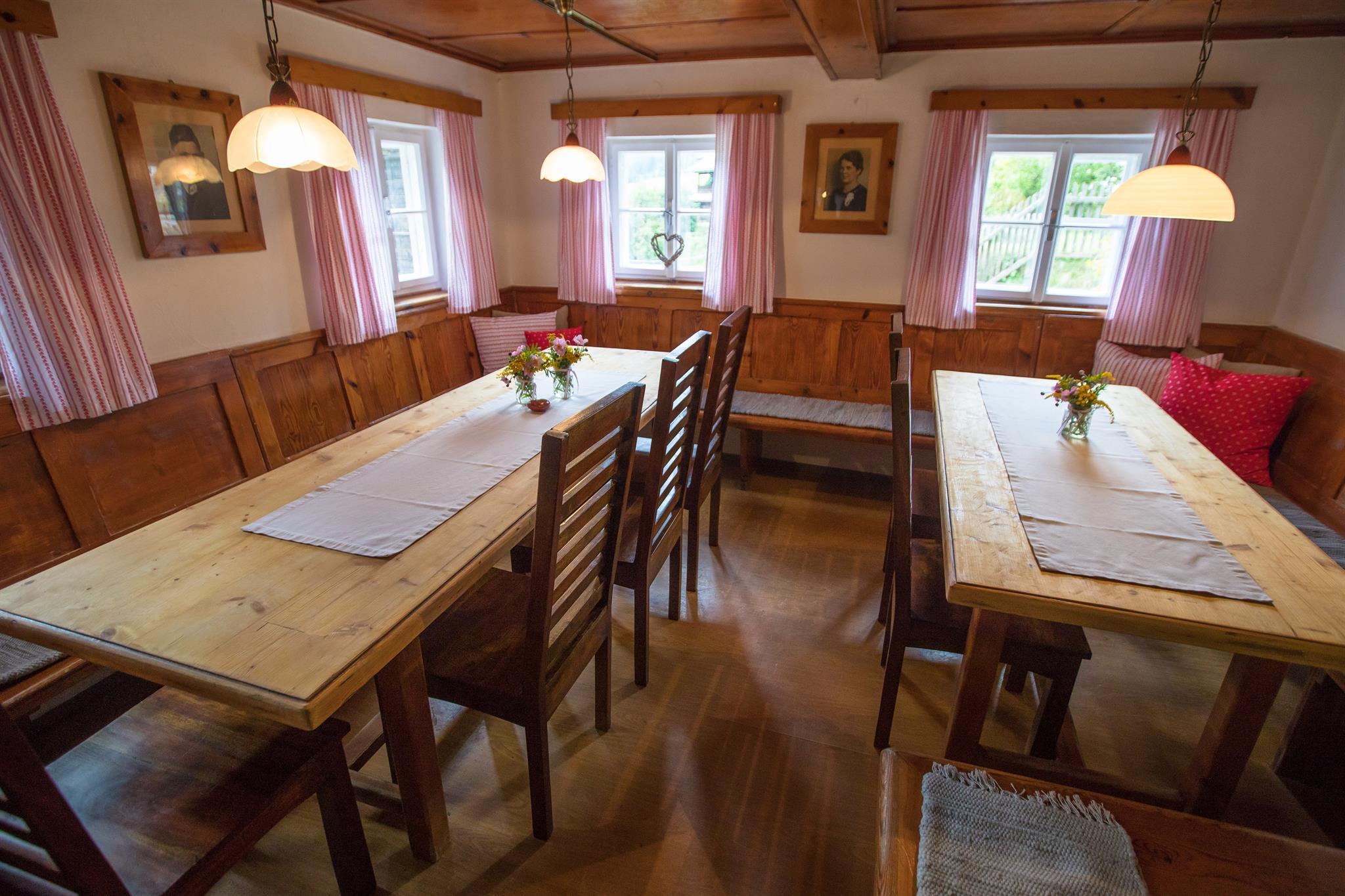 Die Stube im Erdgeschoss ist mit einem gemütlichen Kachelofen ausgestattet und hat zwei große Tische.