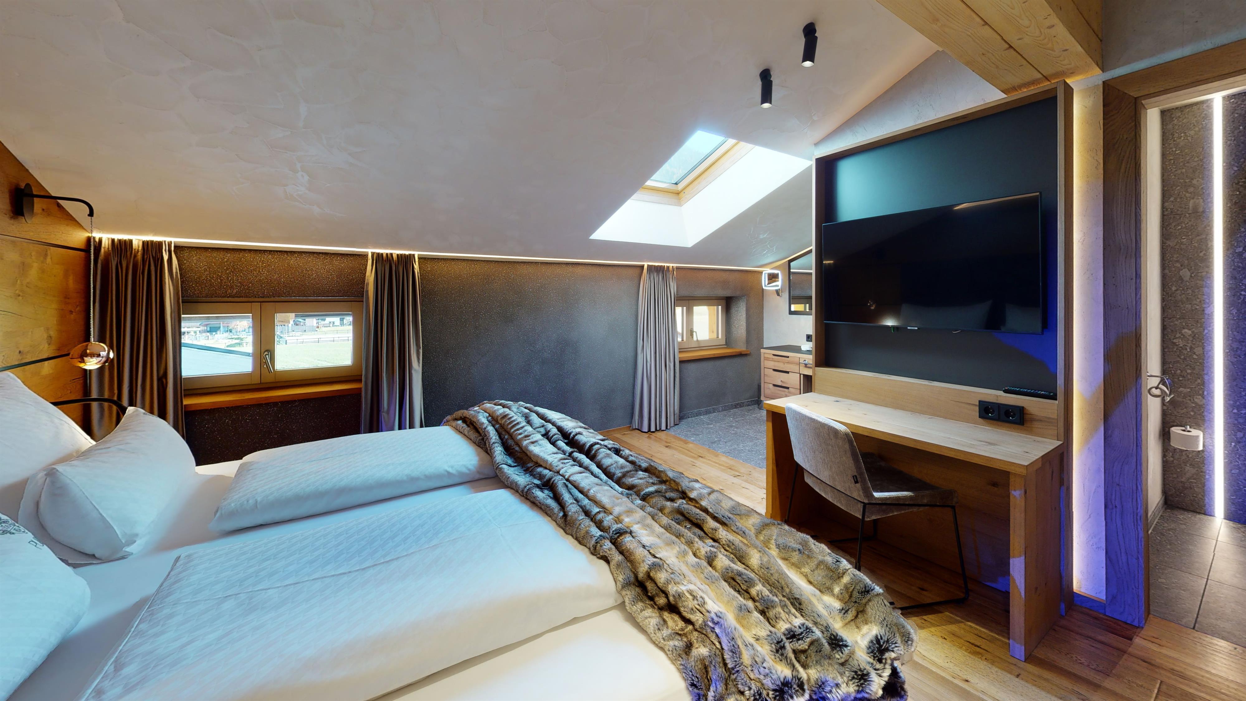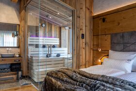 2 große Schlafzimmer mit je 2 Boxspring-Doppelbetten sowie für jedes Schlafzimmer 1 Flat-TV, Private Spa-Bereich mit 2 großen Badezimmern. 1 Bad mit Du/Waschbecken/WC sowie Fön und das andere Badezimmer mit eigenen Finnischen Sauna und Dusche, moderne Wohnküche mit perfekter Ausstattung: Geschirr, Espressomaschine, Toaster, Wasserkocher, Eletkroherd, Kühlschrank mit Gefrierfach, Geschirrspüler, Essbereich, Relax- Bereich mit Flat-TV und Feuerstelle, 34 m² Panorama-Terrasse mit Whirlpool und Terrassenmöbel.