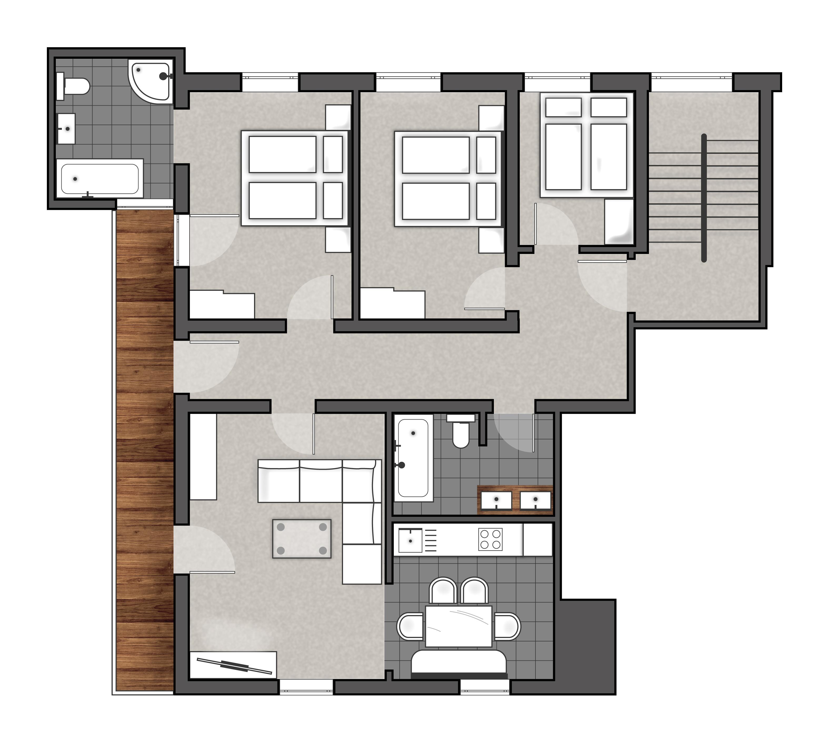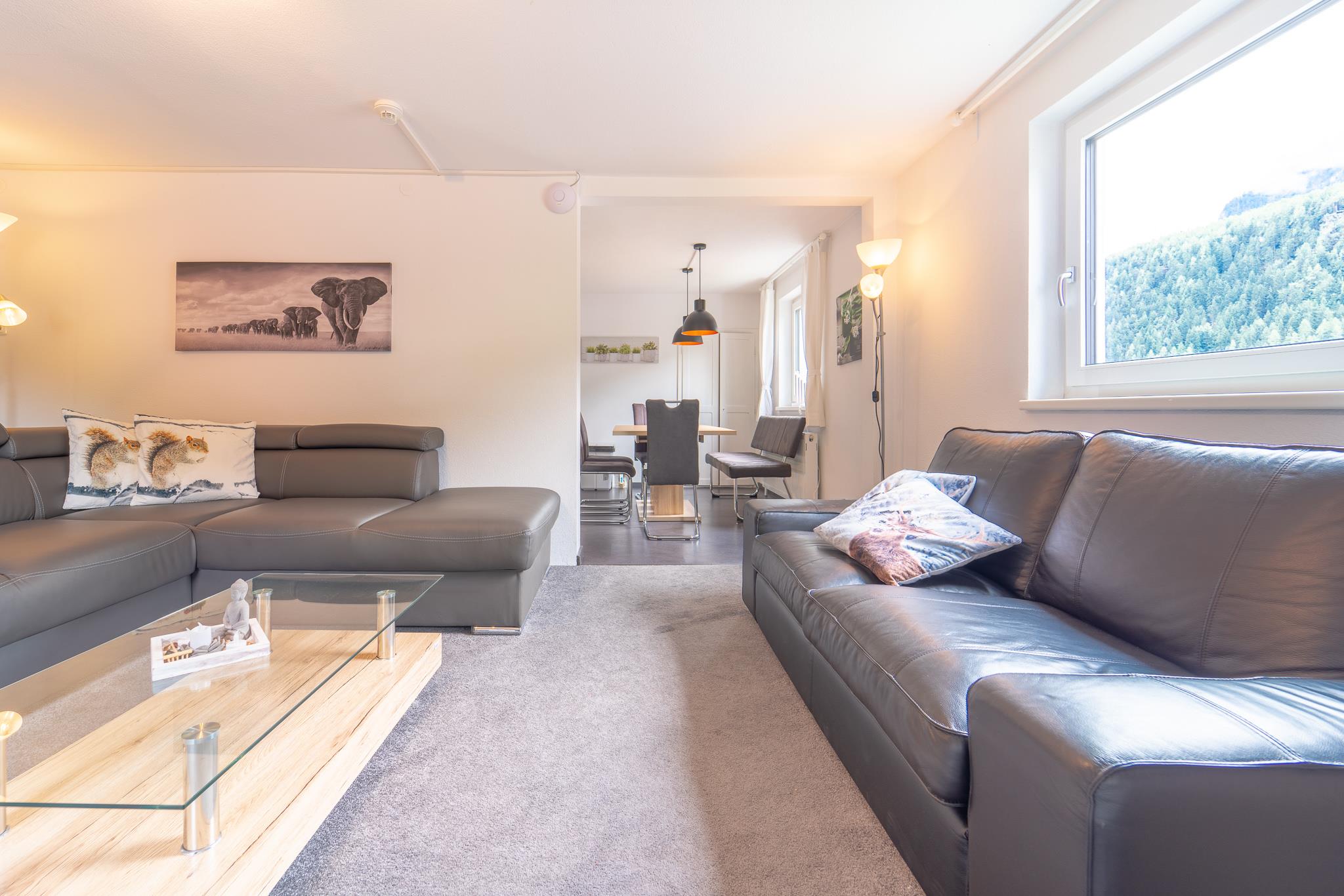 Appartement „Charmy“ (ca. 90 m²) bestehend aus 3 Doppelzimmern, 1 Badezimmer mit Badewanne und Dusche/WC, 1 Badezimmer mit Badewanne/WC), 1 großzügigen, vollausgestatteten Wohnküche (Induktionskochfeld, Geschirrspülmaschine inkl. Spülmaschinentabs, Kühlschrank mit Gefrierschrank, Teekocher, Filter Kaffeekocher uvm.) und Smart Flat Full HD TV (Netflix oder Prime mit eigenem Abo). Genießen Sie auf dem möblierten Balkon das Bergpanorama der Ötztaler Alpen.