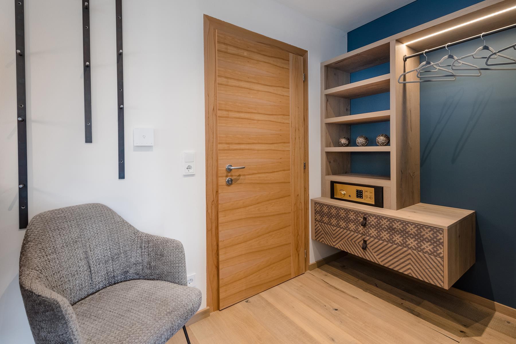 • 1 Schlafzimmer mit Boxspringbett, Eichenholzboden, offenem Kleiderschrank und Verdunkelungsvorhängen