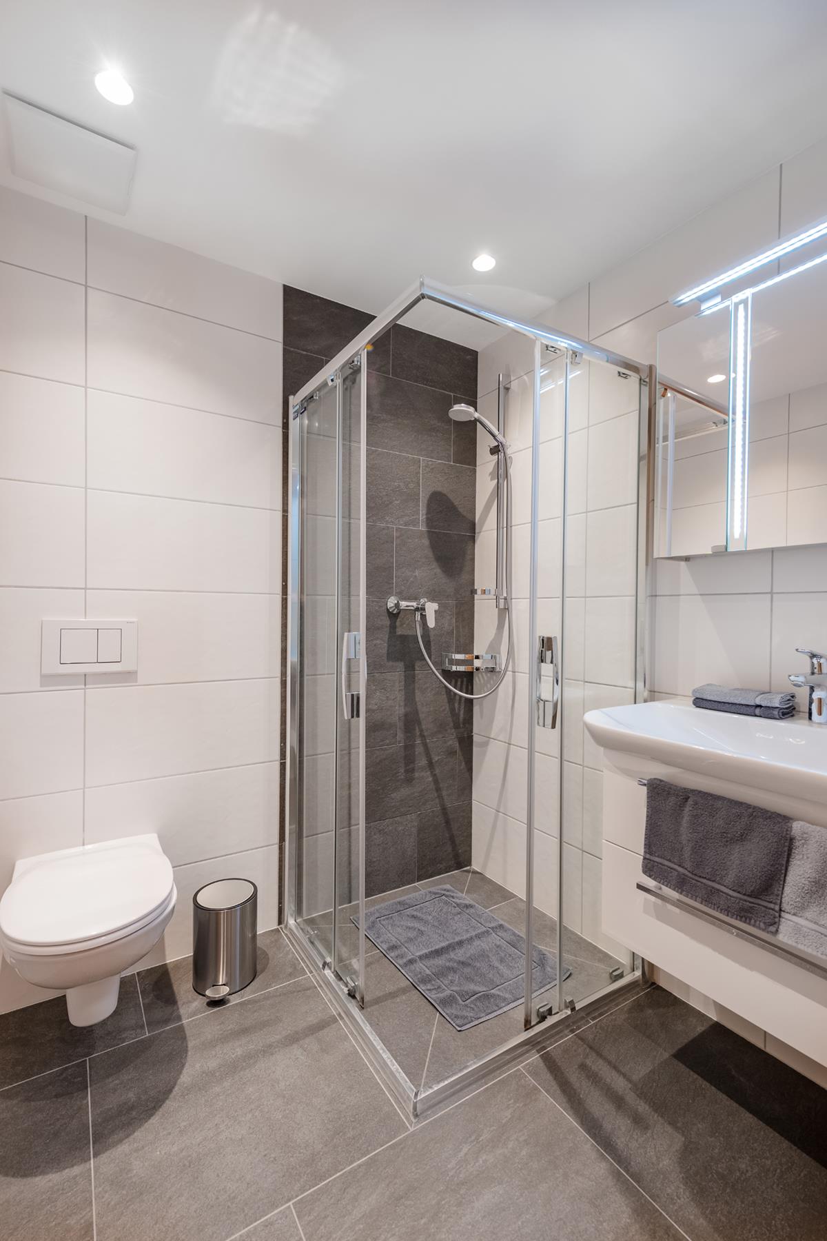 • modernes Badezimmer mit barrierefreier Dusche und WC (Fön, Kosmetikspiegel, Radio)