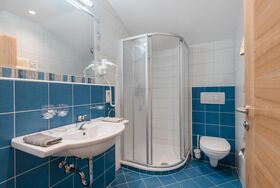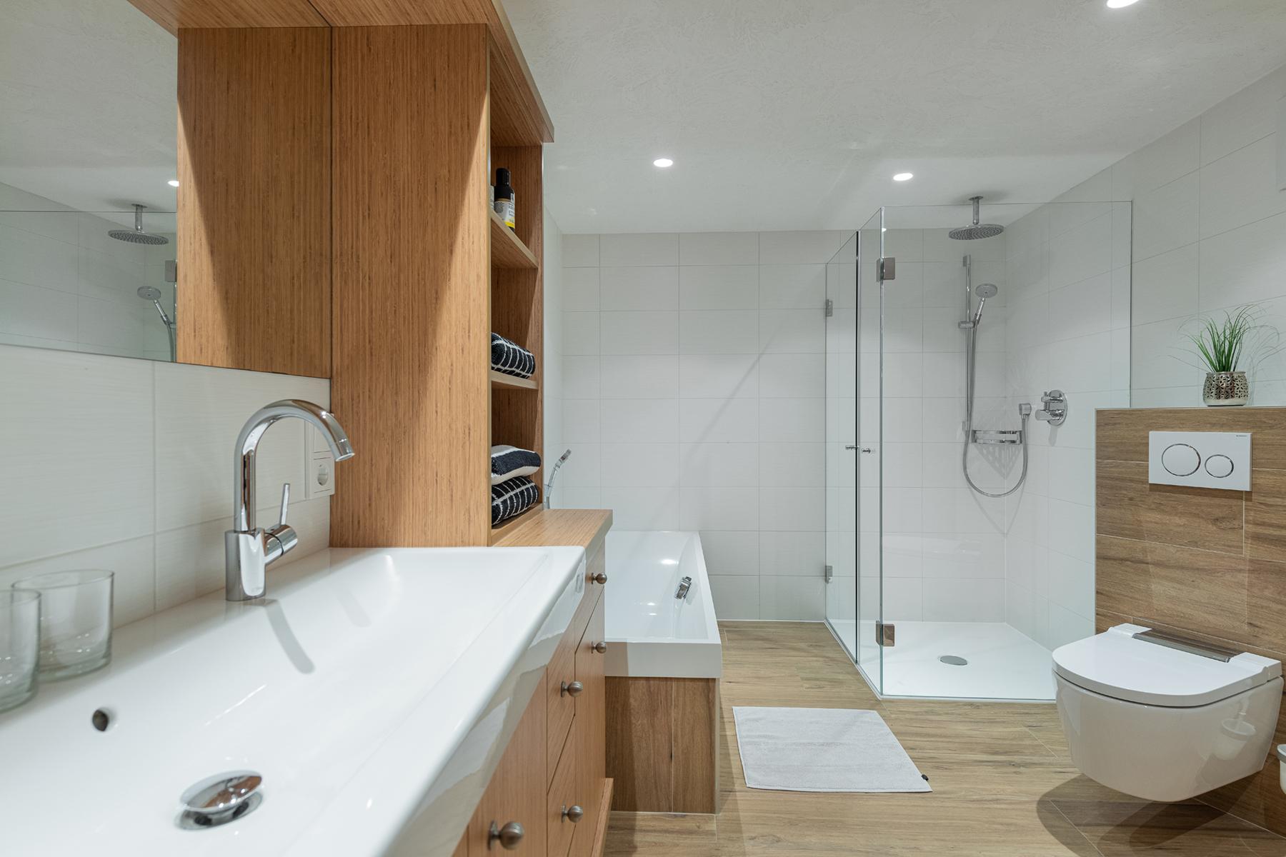• modernes Badezimmer mit barrierefreier Dusche und WC (Fön, Kosmetikspiegel, Radio)