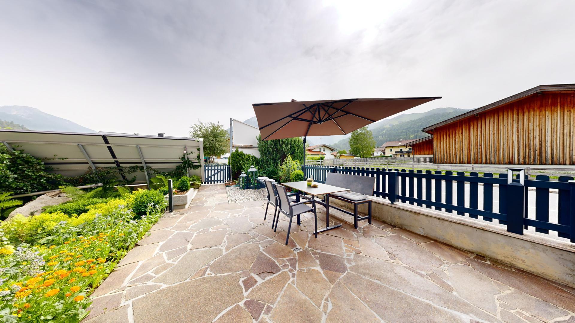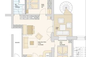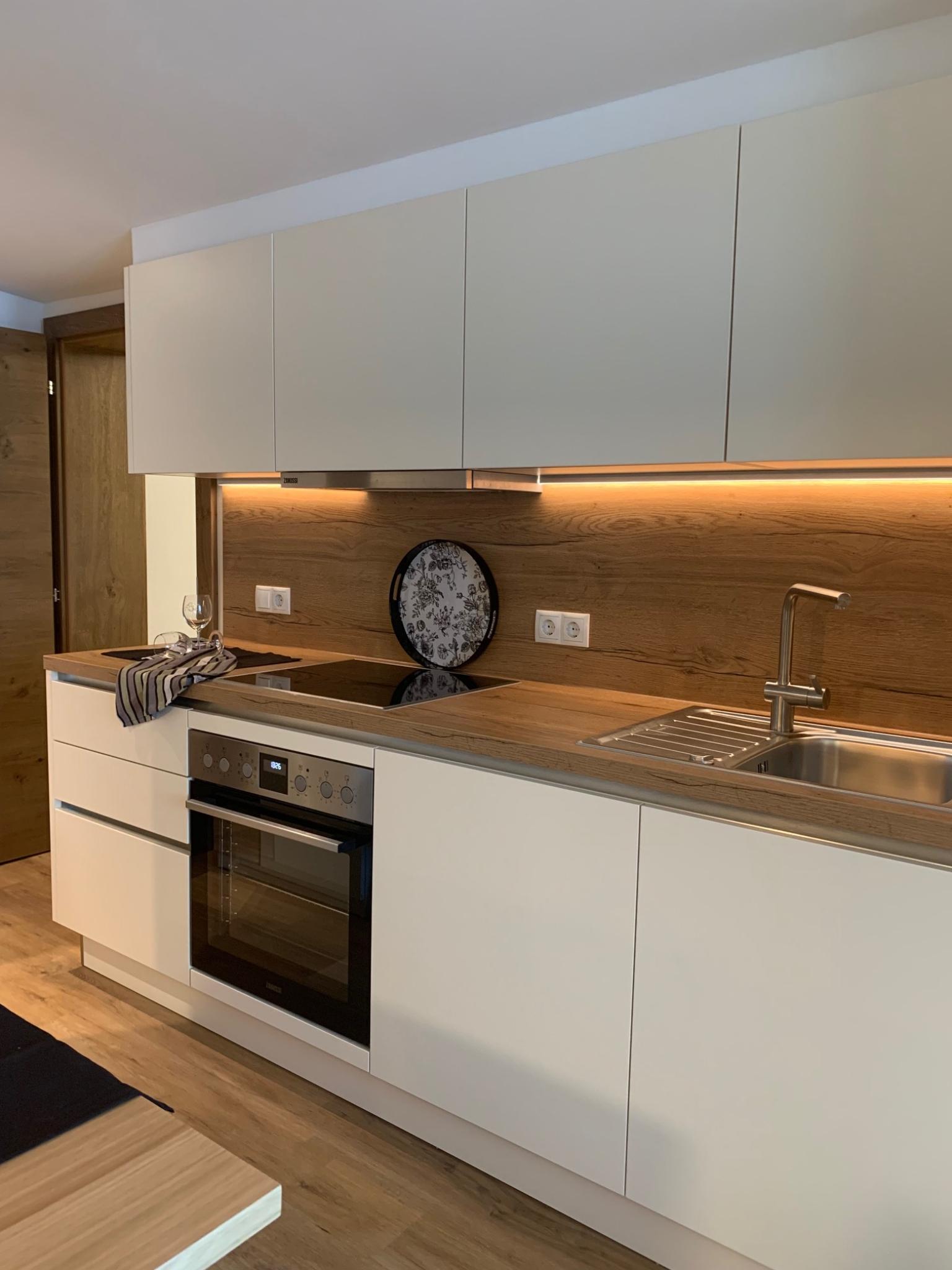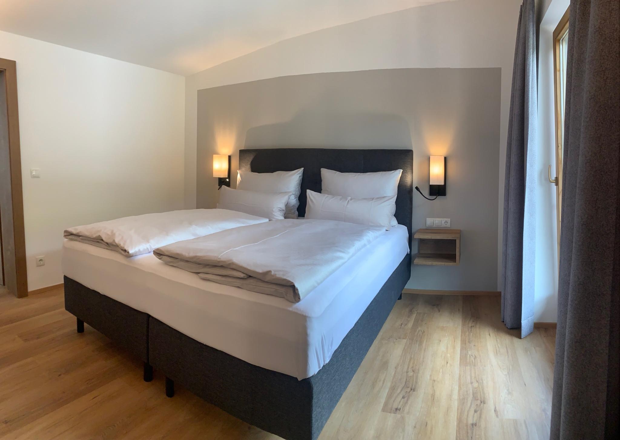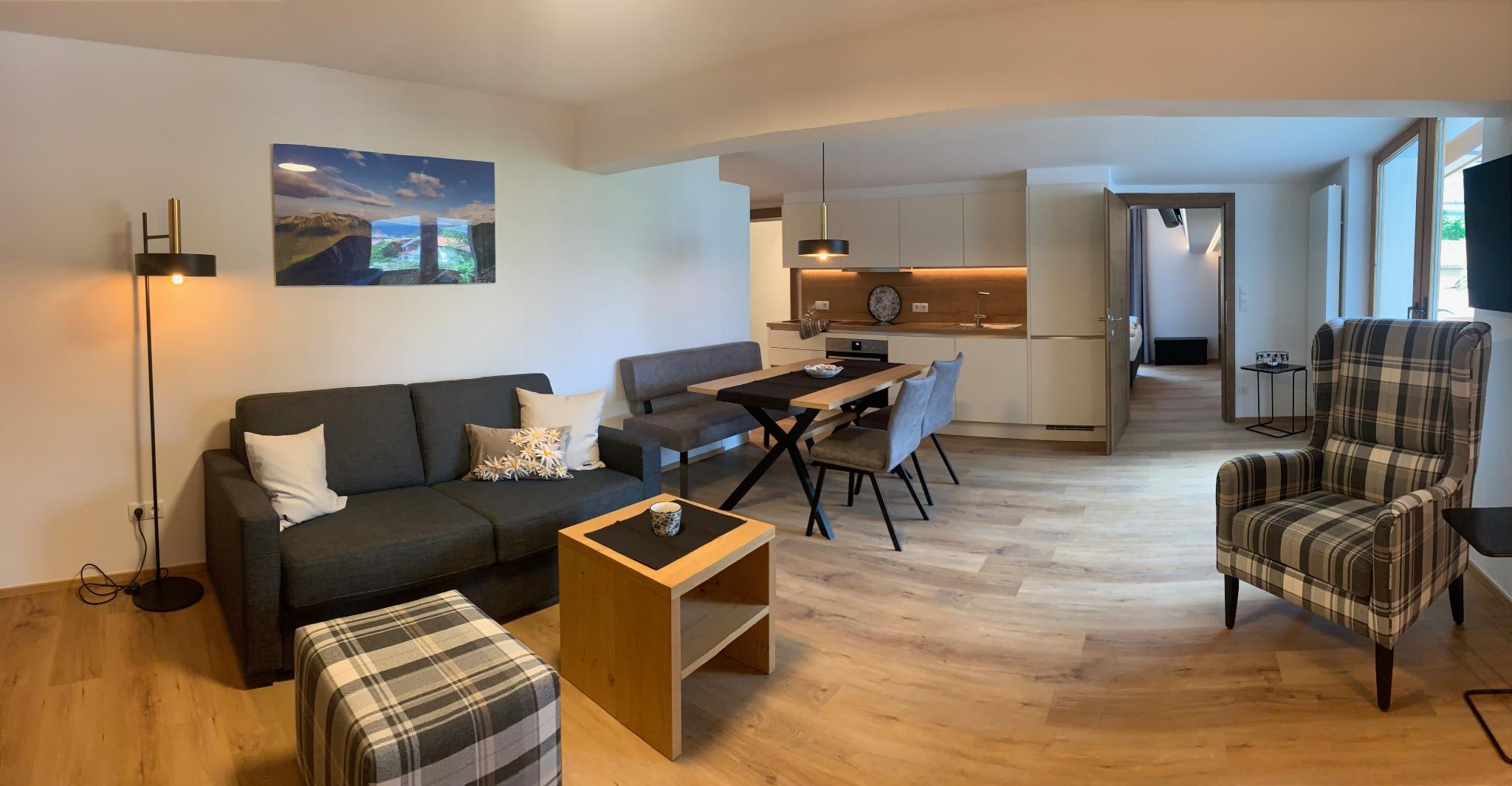 Diese großzügige Ferienwohnung mit unserer neuen ALPIN KOMFORT Ausstattung besteht aus 2 Schlafzimmern mit jeweils 1 Doppelbett, 1 Badezimmer mit Dusche und WC, 1 hochwertig ausgestattete Wohnküche mit Essplatz und 1 Wohnbereich mit gemütlicher Lounge mit 1 Ohrensessel, 1 Hocker und einer Ausziehcouch für 2 vollwertige Schlafmöglichkeiten. Holz für den Kachelofen stellen wir Ihnen gerne kostenlos zur Verfügung. Eine Terrasse mit Wendeltreppe in den Garten ist ein sehr beliebter Frühstücksplatz im Sommer