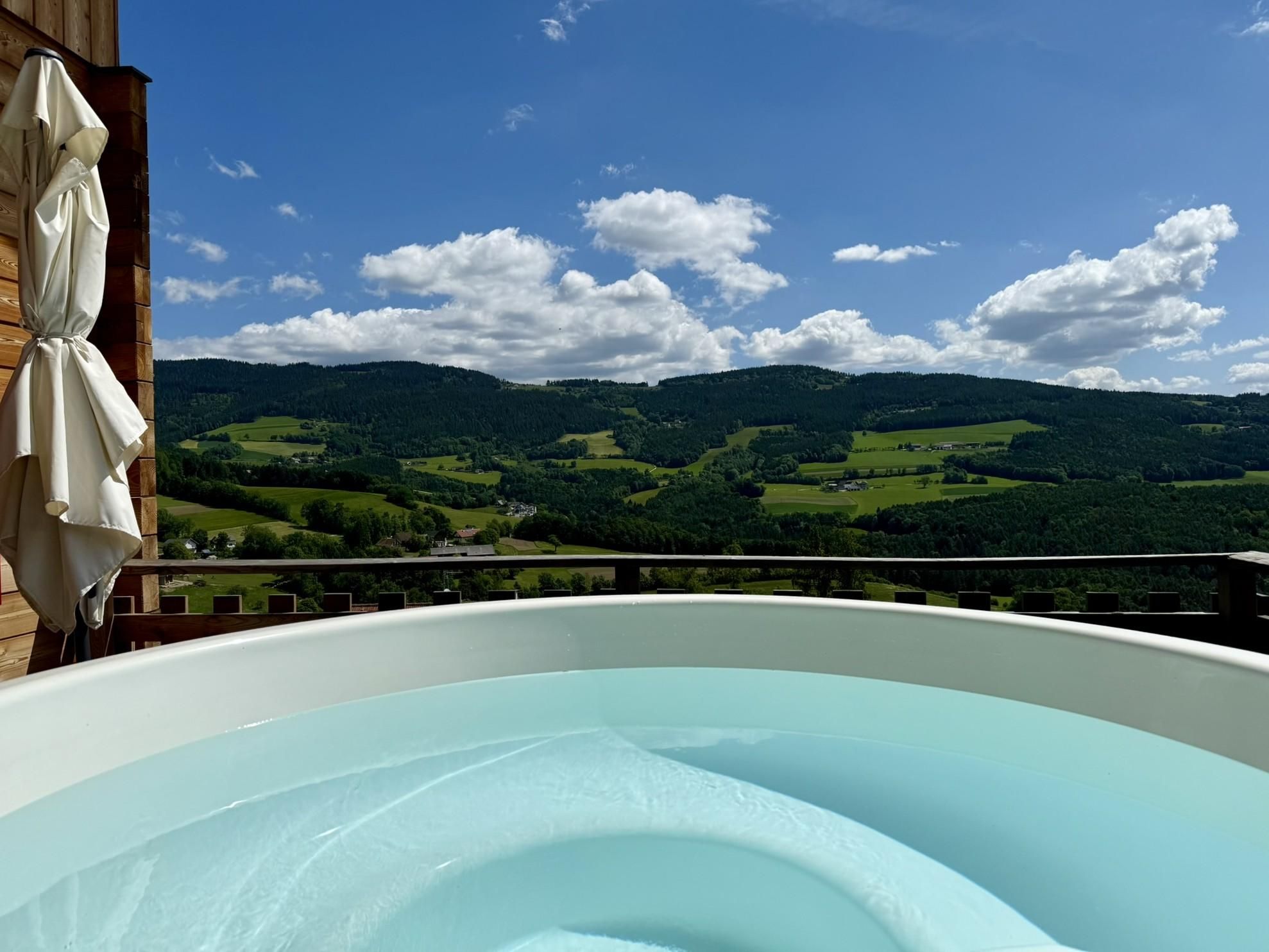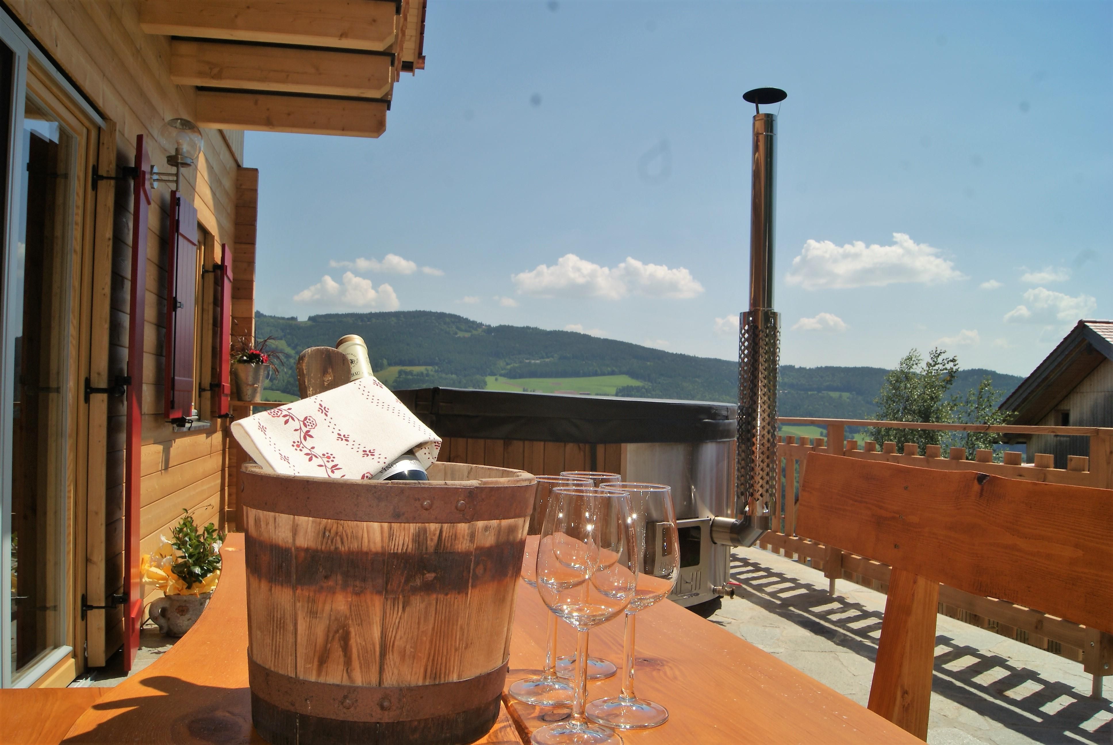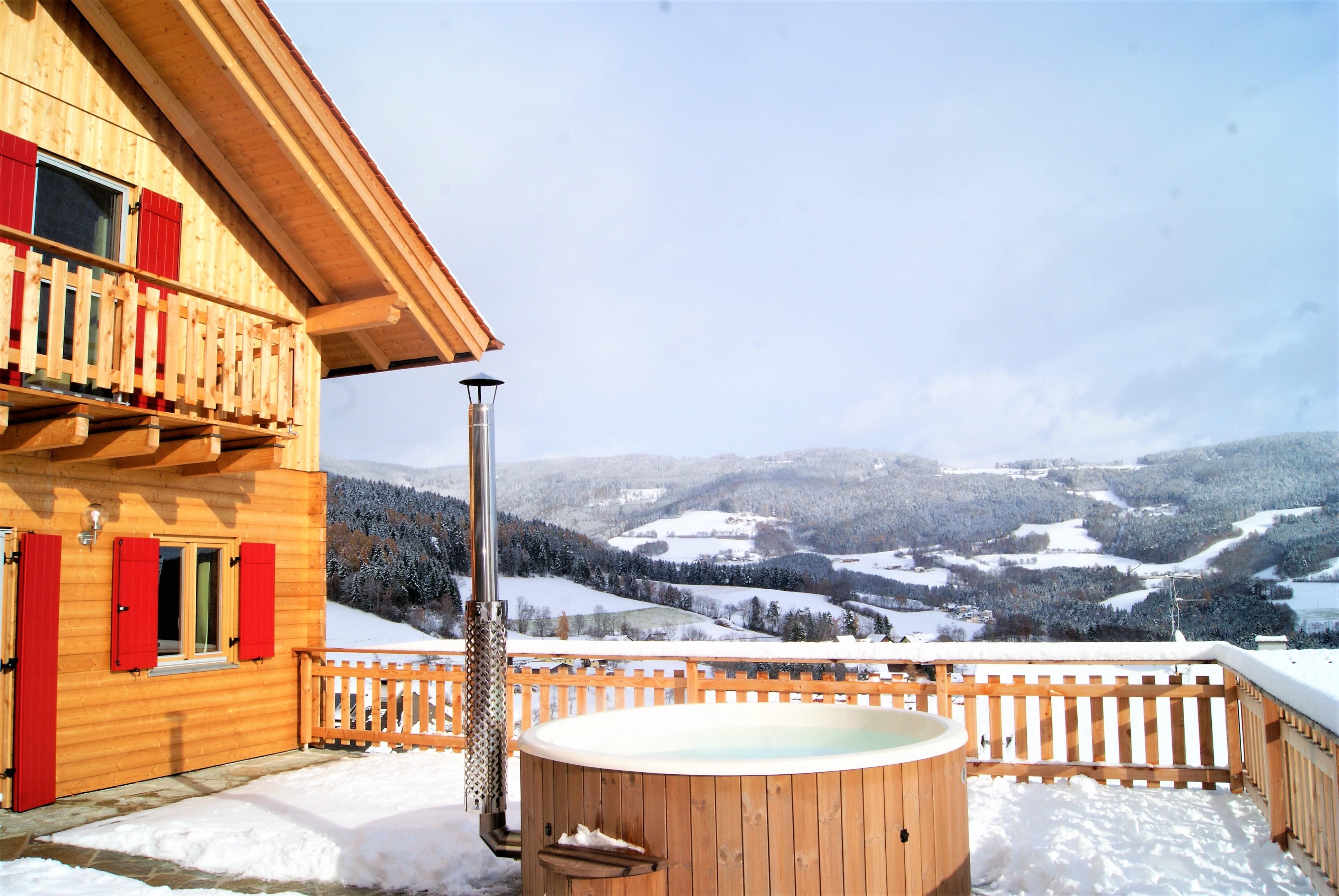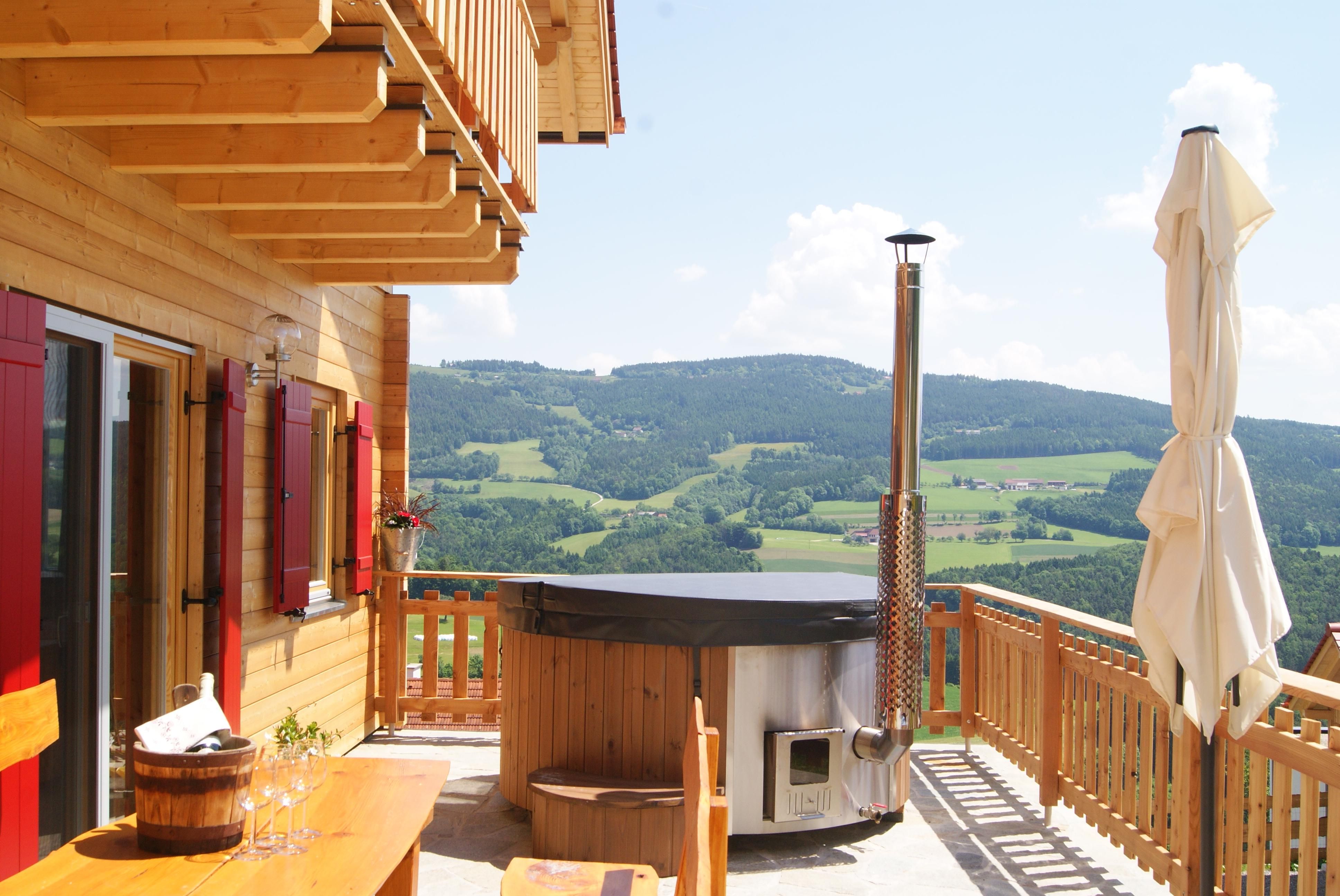 Neues Chalet, zwei Schlafzimmer mit eigenem Badezimmer und Smart TV, großer Wohn- Essbereich mit großem Smart TV, Kachelofen, Sauna, beheizbarer Pool - Hot Pot, große Terrasse mit traumhaftem Ausblick, am Waldrand, ruhige Lage, Teich in der Nachbarschaft