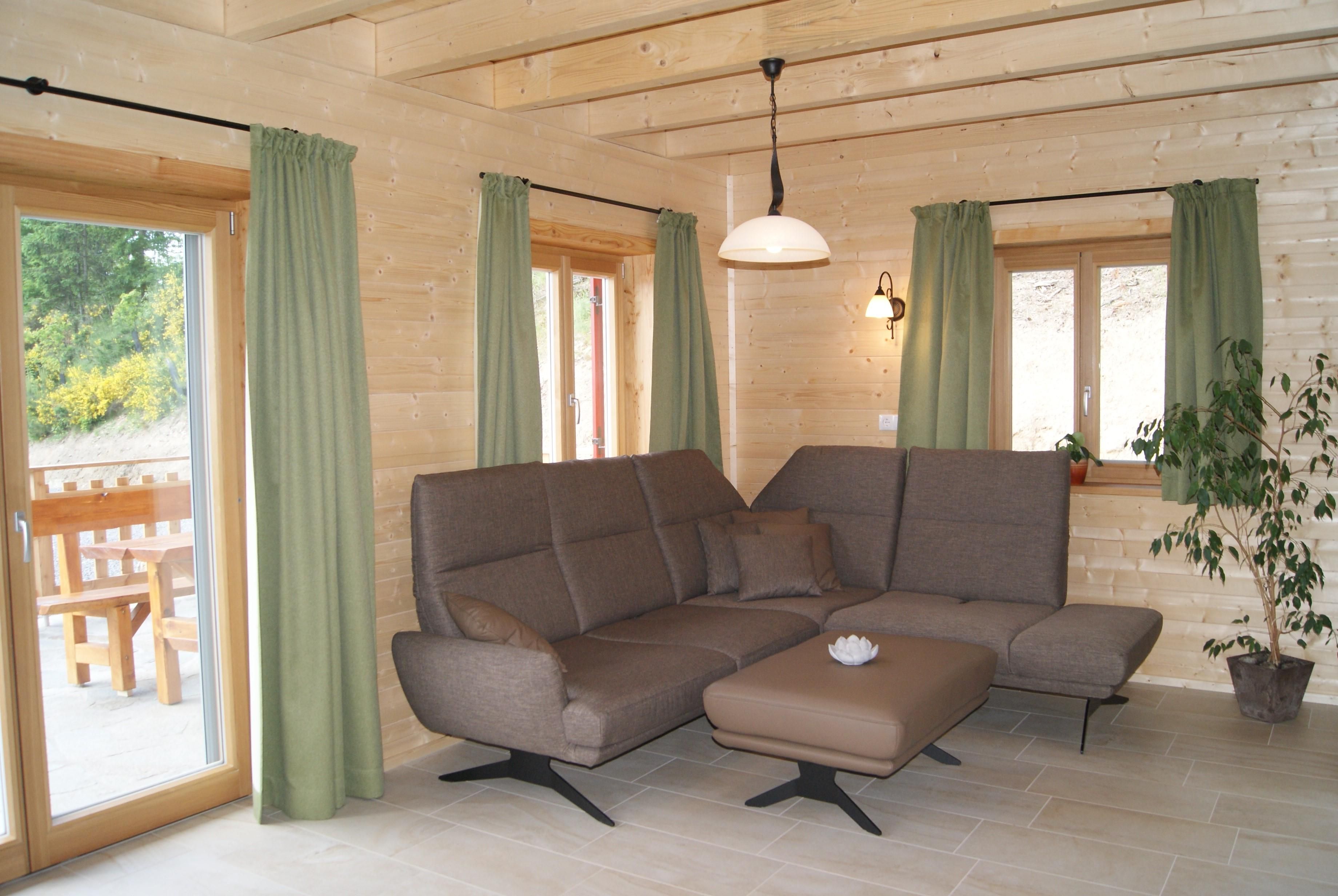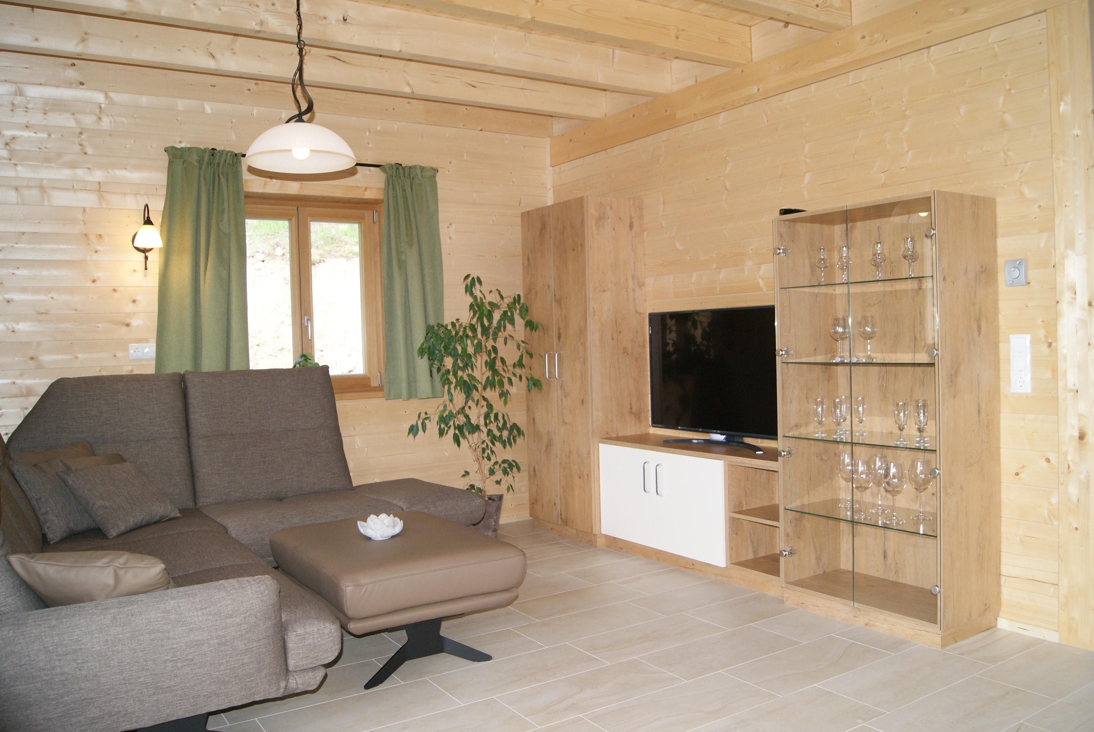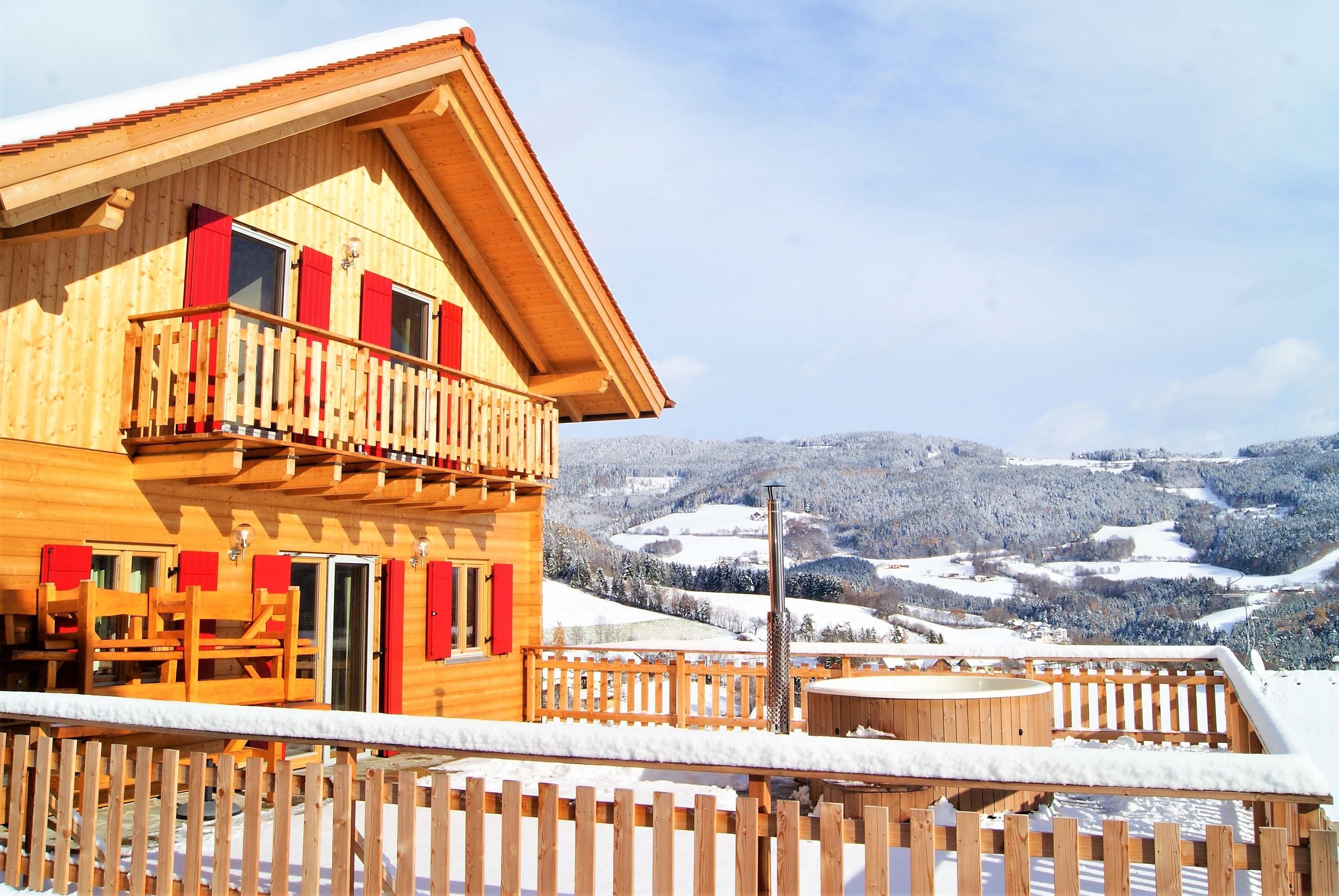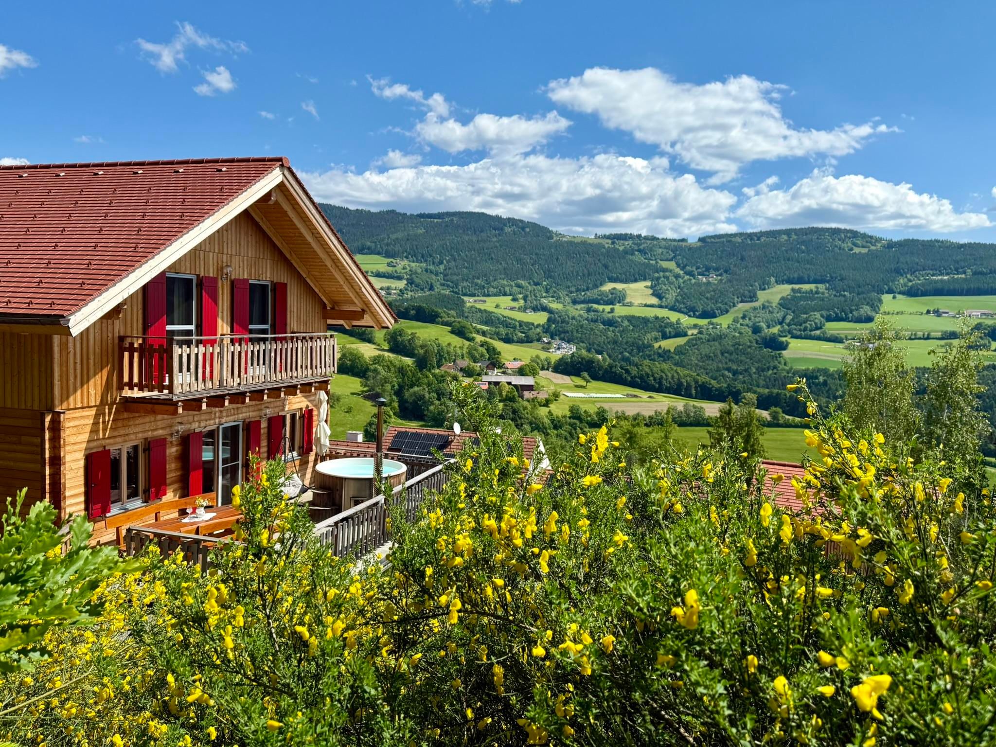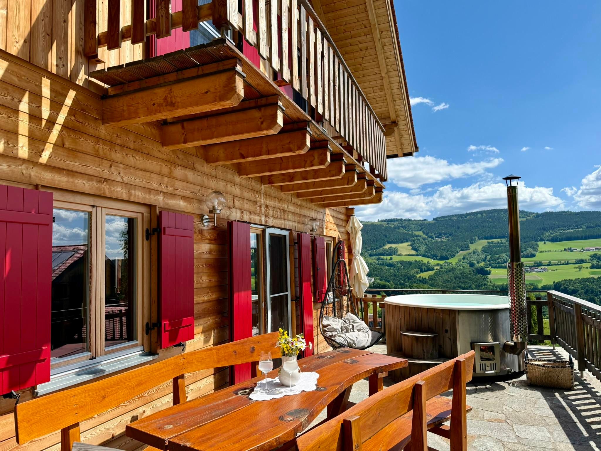 Neues Chalet, zwei Schlafzimmer mit eigenem Badezimmer und Smart TV, großer Wohn- Essbereich mit großem Smart TV, Kachelofen, Sauna, beheizbarer Pool - Hot Pot, große Terrasse mit traumhaftem Ausblick, am Waldrand, ruhige Lage, Teich in der Nachbarschaft