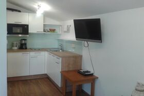 Appartment Einteilung: Schlafzimmer, DU/WC, Wohnküche (Küchenecke, Essbereich, Schlafcouch), Sat-TV & DVD-Player, Internet (W-LAN), Balkon u. Panoramablick.